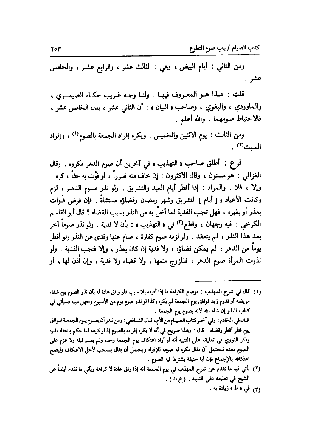ومن الثاني: أيام البيض، وهي: الثالث عشر، والرابع عشر، والخامس عشر. قلت: هذا هو المعروف فيها. ولنا وجه غريب حكاه الصيمري، والماوردي، والبغوي، وصاحب البيان: أن الثاني عشر، بدل الخامس عشر، فالاحتياط صومهما. والله أعلم. ومن الثالث: يوم الاثنين والخميس. ويكره إفراد الجمعة بالصوم، وإفراد السبت. فرع أطلق صاحب التهذيب في آخرين أن صوم الدهر مكروه. وقال الغزالي: هو مسنون، وقال الاكثرون: إن خاف منه ضررا، أو فوت به حقا، كره. وإلا، فلا. والمراد: إذا أفطر أيام العيد والتشريق. ولو نذر صوم الدهر، لزم وكانت الاعياد و (أيام) التشريق وشهر رمضان وقضاؤه مستثناة. فإن فرض فوات بعذر أو بغيره، فهل تجب الفدية لما أخل به من النذر بسبب القضاء ؟ قال أبو القاسم الكرخي: فيه وجهان، وقطع به في التهذيب: بأنه لا فدية. ولو نذر صوما آخر بعد هذا النذر، لم ينعقد. ولو لزمه صوم كفارة، صام عنها وفدى عن النذر. ولو أفطر يوما من الدهر، لم يمكن قضاؤه، ولا فدية إن كان بعذر، وإلا فتجب الفدية. ولو نذرت المرأة صوم الدهر، فللزوج منعها، ولا قضاء ولا فدية، وإن أذن لها، أو