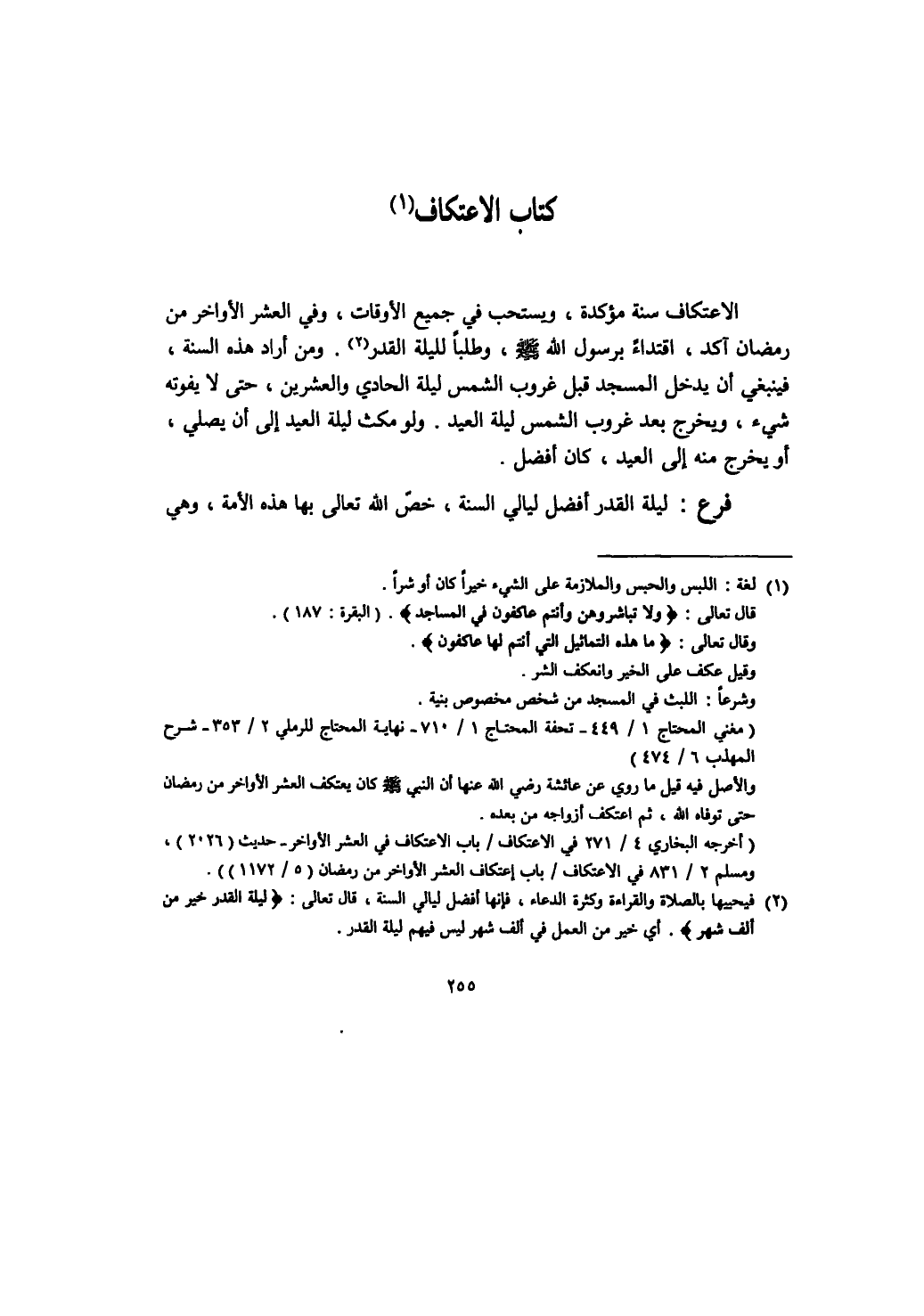 الاعتكاف سنة مؤكدة، ويستحب في جميع الاوقات، وفي العشر الاواخر من رمضان آكد، اقتداء برسول الله - صلى الله عليه وسلم -، وطلبا لليلة القدر. ومن أراد هذه السنة، فينبغي أن يدخل المسجد قبل غروب الشمس ليلة الحادي والعشرين، حتى لا يفوته شئ، ويخرج بعد غروب الشمس ليلة العيد. ولو مكث ليلة العيد إلى أن يصلي، أو يخرج منه إلى العيد، كان أفضل. فرع ليلة القدر أفضل ليالي السنة، خص الله تعالى بها هذه الامة، وهي