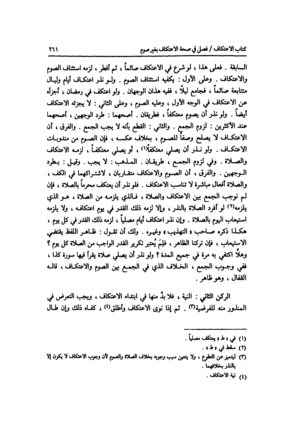 السابقة. فعلى هذا، لو شرع في الاعتكاف صائما، ثم أفطر، لزمه استئناف الصوم والاعتكاف. وعلى الاول: يكفيه استئناف الصوم. ولو نذر اعتكاف أيام وليال متتابعة صائما، فجامع ليلا، ففيه هذان الوجهان. ولو اعتكف في رمضان، أجزأه عن الاعتكاف في الوجه الاول، وعليه الصوم، وعلى الثاني: لا يجزئه الاعتكاف أيضا. ولو نذر أن يصوم معتكفا، فطريقان. أصحهما: طرد الوجهين، أصحهما عند الاكثرين: لزوم الجمع. والثاني: القطع بأنه لا يجب الجمع. والفرق، أن الاعتكاف لا يصلح وصفا للصوم، بخلاف عكسه، فإن الصوم من مندوبات الاعتكاف. ولو نذر أن يعتكف مصليا، أو يصلي معتكفا، لزمه الاعتكاف والصلاة. وفي لزوم الجمع، طريقان. المذهب: لا يجب. وقيل: بطرد الوجهين. والفرق، أن الصوم والاعتكاف متقاربان، لاشتراكهما في الكف، والصلاة أفعال مباشرة لا تناسب الاعتكاف. فلو نذر أن يعتكف محرما بالصلاة، فإن لم نوجب الجمع بين الاعتكاف والصلاة، فالذي يلزمه من الصلاة، هو الذي يلزمه لو أفرد الصلاة بالنذر، وإلا لزمه ذلك القدر في يوم اعتكافه، ولا يلزمه استيعاب اليوم بالصلاة. وإن نذر اعتكاف أيام مصليا، لزمه ذلك القدر في كل يوم، هكذا ذكره صاحب التهذيب وغيره. ولك أن تقول: ظاهر اللفظ يقتضي الاستيعاب، فإن تركنا الظاهر، فلم يعتبر تكرير القدر الواجب من الصلاة كل يوم ؟ وهلا اكتفي به مرة في جميع المدة ؟ ولو نذر أن يصلي صلاة يقرأ فيها سورة كذا، ففي وجوب الجمع، الخلاف الذي في الجمع بين الصوم والاعتكاف، قاله القفال، وهو ظاهر. الركن الثاني: النية، فلا بد منها في ابتداء الاعتكاف، ويجب التعرض في المنذور منه للفرضية. ثم إذا نوى الاعتكاف وأطلق، كفاه ذلك وإن طال