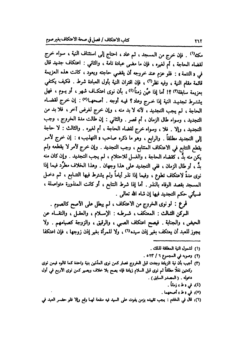 مكثه. فإن خرج من المسجد، ثم عاد، احتاج إلى استئناف النية، سواء خرج لقضاء الحاجة، أم لغيره، فإن ما مضى عبادة تامة، والثاني: اعتكاف جديد قال في التتمة: فلو عزم عند خروجه أن يقضي حاجته ويعود، كانت هذه العزيمة قائمة مقام النية، وفيه نظر، فإن اقتران النية بأول العبادة شرط. فكيف يكتفي بعزيمة سابقة ؟ أما إذا عين زمانا، بأن نوى اعتكاف شهر، أو يوم، فهل يشترط تجديد النية إذا خرج وعاد ؟ فيه أوجه. أصحهما: إن خرج لقضاء الحاجة، لم يجب التجديد، لانه لا بد منه، وإن خرج لغرض آخر، فلا بد من التجديد، وسواء طال الزمان، أم قصر. والثاني: إن طالت مدة الخروج، وجب التجديد، وإلا، فلا، وسواء خرج لقضاء الحاجة، أم لغيره. والثالث: لا حاجة إلى التجديد مطلقا. والرابع: هو ما ذكره صاحب التهذيب: إن خرج لامر يقطع التتابع في الاعتكاف المتتابع، وجب التجديد. وإن خرج لامر لا يقطعه ولم يكن منه بد، كقضاء الحاجة، والغسل للاحتلام، لم يجب التجديد. وإن كان منه بد، أو طال الزمان، ففي التجديد على هذا وجهان. وهذا الخلاف مطرد فيما إذا نوى مدة لاعتكاف تطوع، وفيما إذا نذر أياما ولم يشرط فيها التتابع، ثم دخل المسجد بقصد الوفاء بالنذر. أما إذا شرط التتابع، أو كانت المنذورة متواصلة، فسيأتي حكم التجديد فيها إن شاء الله تعالى. فرع لو نوى الخروج من الاعتكاف، لم يبطل على الاصح كالصوم. الركن الثالث: المعتكف، شرطه: الاسلام، والعقل، والنقاء عن الحيض، والجنابة. فيصح اعتكاف الصبي، والرقيق، والزوجة كصيامهم. ولا يجوز للعبد أن يعتكف بغير إذن سيده، ولا للمرأة بغير إذن زوجها، فإن اعتكفا