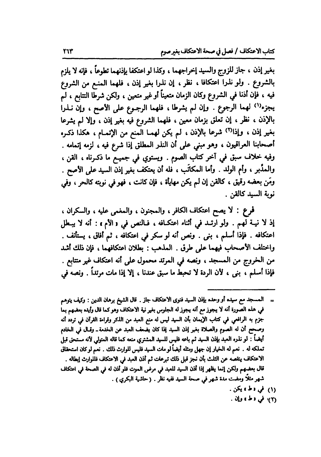 بغير إذن، جاز للزوج والسيد إخراجهما. وكذا لو اعتكفا بإذنهما تطوعا، فإنه لا يلزم بالشروع. ولو نذرا اعتكافا، نظر، إن نذرا بغير إذن، فلهما المنع من الشروع فيه، فإن أذنا في الشروع وكان الزمان متعينا أو غير متعين، ولكن شرطا التتابع، لم يجوز لهما الرجوع. وإن لم يشرطا، فلهما الرجوع على الاصح، وإن نذرا بالاذن، نظر، إن تعلق بزمان معين، فلهما الشروع فيه بغير إذن، وإلا لم يشرعا بغير إذن، وإن شرعا بالاذن، لم يكن لهما المنع من الاتمام، هكذا ذكره أصحابنا العراقيون، وهو مبني على أن النذر المطلق إذا شرع فيه، لزمه إتمامه. وفيه خلاف سبق في آخر كتاب الصوم. ويستوي في جميع ما ذكرناه، القن، والمدبر، وأم الولد. وأما المكاتب، فله أن يعتكف بغير إذن السيد على الاصح. ومن بعضه رقيق، كالقن إن لم يكن مهايأة، فإن كانت، فهو في نوبته كالحر، وفي نوبة السيد كالقن. فرع لا يصح اعتكاف الكافر، والمجنون، والمغمى عليه، والسكران، إذ لا نية لهم. ولو ارتد في أثناء اعتكافه، فالنص في الام: أنه لا يبطل اعتكافه. فإذا أسلم، بنى. ونص أنه لو سكر في اعتكافه، ثم أفاق، يستأنف. واختلف الاصحاب فيهما على طرق. المذهب: بطلان اعتكافهما، فإن ذلك أشد من الخروج من المسجد، ونصه في المرتد محمول على أنه اعتكاف غير متتابع. فإذا أسلم، بنى، لان الردة لا تحبط ما سبق عندنا، إلا إذا مات مرتدا. ونصه في