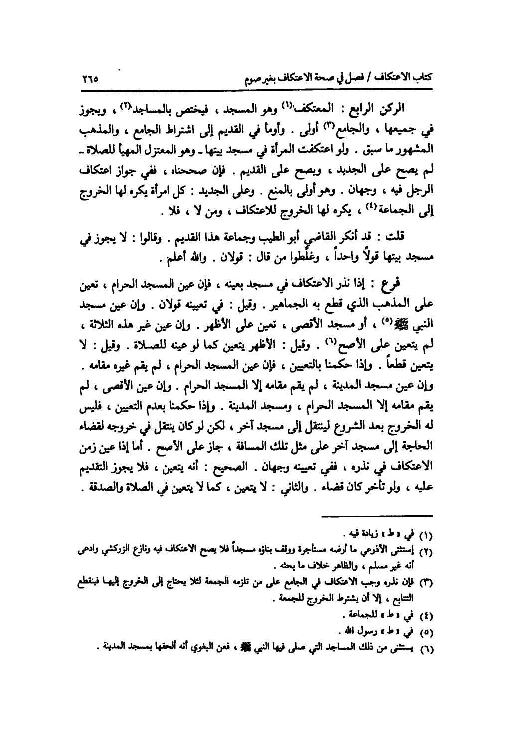 الركن الرابع: المعتكف فيه وهو المسجد، فيختص بالمساجد، ويجوز في جميعها، والجامع أولى. وأومأ في القديم إلى اشتراط الجامع، والمذهب المشهور ما سبق. ولو اعتكفت المرأة في مسجد بيتها - وهو المعتزل المهيأ للصلاة - لم يصح على الجديد، ويصح على القديم. فإن صححناه، ففي جواز اعتكاف الرجل فيه، وجهان. وهو أولى بالمنع. وعلى الجديد: كل امرأة يكره لها الخروج إلي للجماعة، يكره لها الخروج للاعتكاف، ومن لا، فلا. قلت: قد أنكر القاضي أبو الطيب وجماعة هذا القديم. وقالوا: لا يجوز في مسجد بيتها قولا واحدا، وغلطوا من قال: قولان. والله أعلم. فرع إذا نذر الاعتكاف في مسجد بعينه، فإن عين المسجد الحرام، تعين على المذهب الذي قطع به الجماهير. وقيل: في تعيينه قولان. وإن عين مسجد النبي - صلى الله عليه وسلم -، أو مسجد الاقصى، تعين على الاظهر. وإن عين غير هذه الثلاثة، لم يتعين على الاصح. وقيل: الاظهر يتعين كما لو عينه للصلاة. وقيل: لا يتعين قطعا. وإذا حكمنا بالتعيين، فإن عين المسجد الحرام، لم يقم غيره مقامه. وإن عين مسجد المدينة، لم يقم مقامه إلا المسجد الحرام. وإن عين الاقصى، لم يقم مقامه إلا المسجد الحرام، ومسجد المدينة. وإذا حكمنا بعدم التعيين، فليس له الخروج بعد الشروع لينتقل إلى مسجد آخر، لكن لو كان ينتقل في خروجه لقضاء الحاجة إلى مسجد آخر على مثل تلك المسافة، جاز على الاصح. أما إذا عين زمن الاعتكاف في نذره، ففي تعيينه وجهان. الصحيح: أنه يتعين، فلا يجوز التقديم عليه، ولو تأخر كان قضاء. والثاني: لا يتعين، كما لا يتعين في الصلاة والصدقة