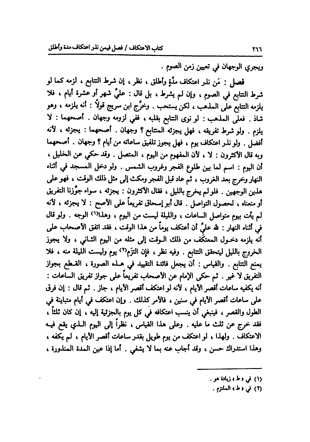 فصل من نذر اعتكاف مدة وأطلق، نظر، إن شرط التتابع، لزمه كما لو شرط التتابع في الصوم، وإن لم يشرط، بل قال: علي شهر أو عشرة أيام، فلا يلزمه التتابع على المذهب، لكن يستحب. وخرج ابن سريج قولا: أنه يلزمه، وهو شاذ. فعلى المذهب: لو نوى التتابع بقلبه، ففي لزومه وجهان. أصحهما: لا يلزم. ولو شرط تفريقه، فهل يجزئه المتتابع ؟ وجهان. أصحهما: يجزئه، لانه أفضل. ولو نذر اعتكاف يوم، فهل يجوز تلفيق ساعاته من أيام ؟ وجهان. أصحهما وبه قال الاكثرون: لا، لان المفهوم من اليوم، المتصل. وقد حكي عن الخليل، أن اليوم: اسم لما بين طلوع الفجر وغروب الشمس. ولو دخل المسجد في أثناء النهار وخرج بعد الغروب، ثم عاد قبل الفجر ومكث إلى مثل لك الوقت، فهو على هذين الوجهين. فلو لم يخرج بالليل، فقال الاكثرون: يجزئه، سواء جوزنا التفريق أو منعناه، لحصول التواصل. قال أبو إسحق تفريعا على الاصح: لا يجزئه، لانه لم يأت بيوم متواصل الساعات، والليلة ليست من اليوم، وهذا هو الوجه. ولو قال في أثناء النهار: لله علي أن أعتكف يوما من هذا الوقت، فقد اتفق الاصحاب على أنه يلزمه دخول المعتكف من ذلك الوقت إلى مثله من اليوم الثاني، ولا يجوز الخروج بالليل ليتحقق التتابع. وفيه نظر، فإن الملتزم يوم وليست الليلة منه، فلا يمنع التتابع. والقياس: أن يجعل فائدة التقييد في هذه الصورة، القطع بجواز التفريق لا غير. ثم حكى الامام عن الاصحاب تفريعا على جواز تفريق الساعات: أنه يكفيه ساعات أقصر الايام، لانه لو اعتكف أقصر الايام، جاز. ثم قال: إن فرق على ساعات أقصر الايام في سنين، فالامر كذلك. وإن اعتكف في أيام متباينة في الطول والقصر، فينبغي أن ينسب اعتكافه في كل يوم بالجزئية إليه، إن كان ثلثا، فقد خرج عن ثلث ما عليه. وعلى هذا القياس، نظرا إلى اليوم الذي يقع فيه الاعتكاف. ولهذا، لو اعتكف من يوم طويل بقدر ساعات أقصر الايام، لم يكفه، وهذا استدراك حسن، وقد أجاب عنه بما لا يشفي. أما إذا عين المدة المنذورة،
