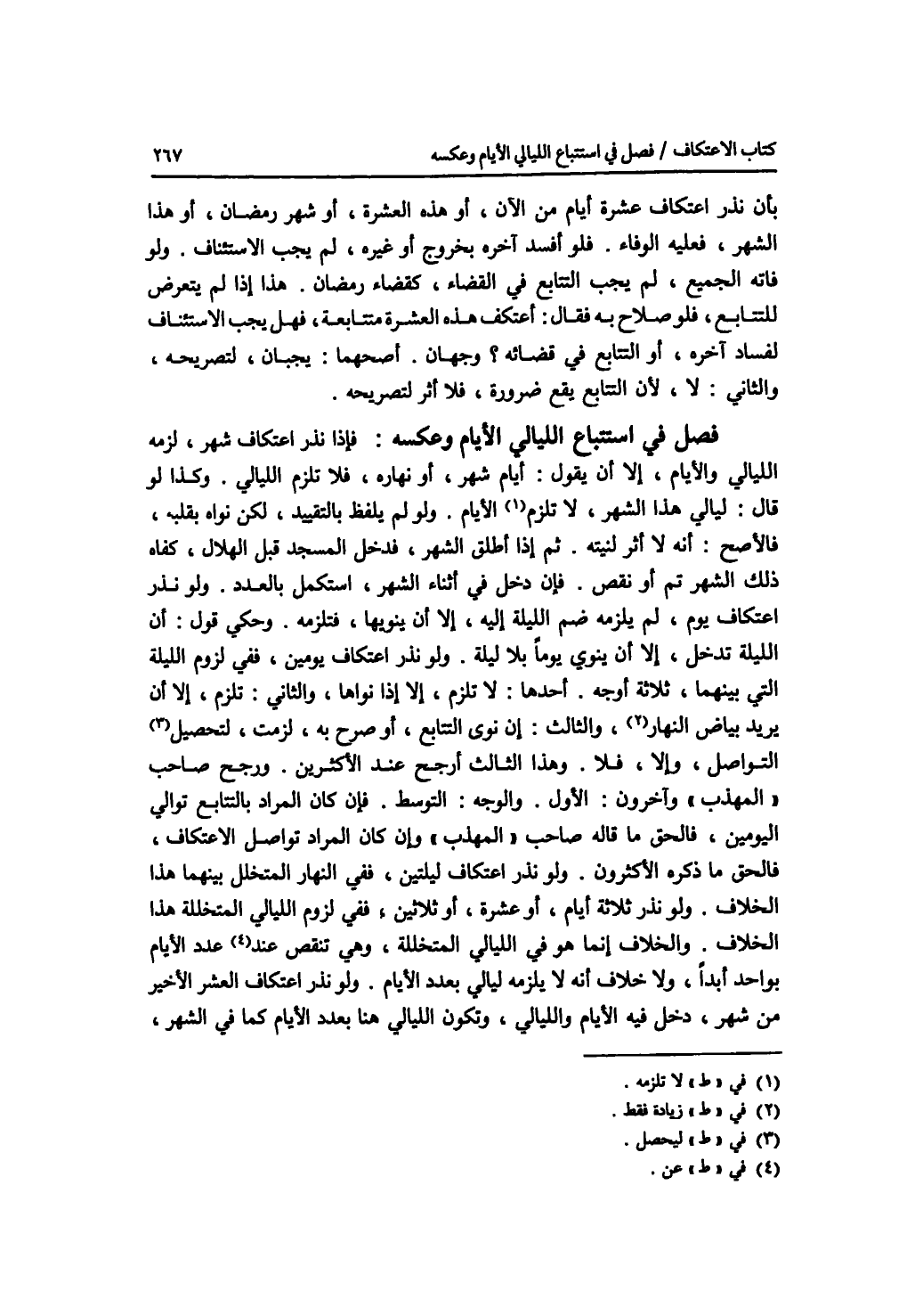 فصل في استتباع الليالي الايام وعكسه فإذا نذر اعتكاف شهر، لزمه الليالي والايام، إلا أن يقول: أيام شهر، أو نهاره، فلا تلزم الليالي. وكذا لو قال: ليالي هذا الشهر، لا تلزمه الايام. ولو لم يلفظ بالتقييد، لكن نواه بقلبه، فالاصح: أنه لا أثر لنيته. ثم إذا أطلق الشهر، فدخل المسجد قبل الهلال، كفاه ذلك الشهر تم أو نقص. فإن دخل في أثناء الشهر، استكمل بالعدد. ولو نذر اعتكاف يوم، لم يلزمه ضم الليلة إليه، إلا أن ينويها، فتلزمه. وحكي قول: أن الليلة تدخل، إلا أن ينوي يوما بلا ليلة. ولو نذر اعتكاف يومين، ففي لزوم الليلة التي بينهما، ثلاثة أوجه. أحدها: لا تلزم، إلا إذا نواها، والثاني: تلزم، إلا أن يريد بياض النهار فقط، والثالث: إن نوى التتابع، أو صرح به، لزمت، ليحصل التواصل، وإلا، فلا. وهذا الثالث أرجح عند الاكثرين. ورجح صاحب المهذب وآخرون: الاول. والوجه: التوسط. فإن كان المراد بالتتابع توالي اليومين، فالحق ما قاله صاحب المهذب وإن كان المراد تواصل الاعتكاف، فالحق ما ذكره الاكثرون. ولو نذر اعتكاف ليلتين، ففي النهار المتخلل بينهما هذا الخلاف. ولو نذر ثلاثة أيام، أو عشرة، أو ثلاثين، ففي لزوم الليالي المتخللة هذا الخلاف. والخلاف إنما هو في الليالي المتخللة، وهي تنقص عن عدد الايام بواحد أبدا، ولا خلاف أنه لا يلزمه ليالي بعدد الايام. ولو نذر اعتكاف العشر الاخير من شهر، دخل فيه الايام والليالي، وتكون الليالي هنا بعدد الايام كما في الشهر،