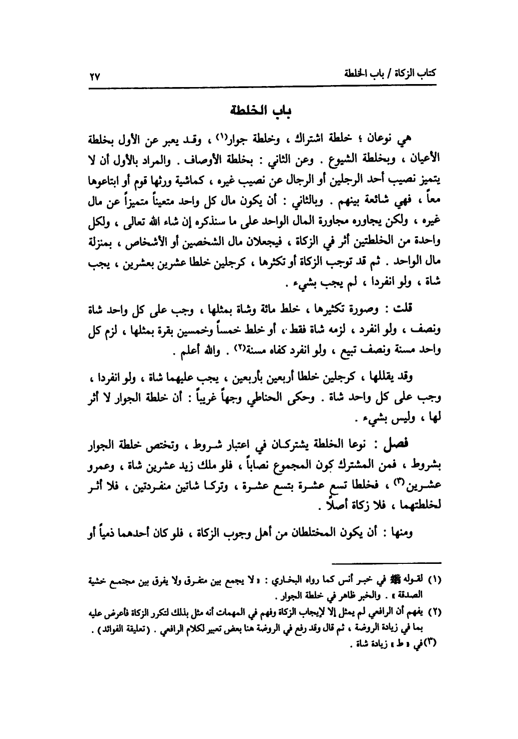 هي نوعان، خلطة اشتراك، وخلطة جوار، وقد يعبر عن الاول بخلطة الاعيان، وبخلطة الشيوع. وعن الثاني: بخلطة الاوصاف. والمراد بالاول أن لا يتميز نصيب أحد الرجلين أو الرجال عن نصيب غيره، كماشية ورثها قوم أو ابتاعوها معا، فهي شائعة بينهم. وبالثاني: أن يكون مال كل واحد متعينا متميزا عن مال غيره، ولكن يجاوره مجاورة المال الواحد على ما سنذكره إن شاء الله تعالى، ولكل واحدة من الخلطتين أثر في الزكاة، فيجعلان مال الشخصين أو الاشخاص، بمنزلة مال الواحد. ثم قد توجب الزكاة أو تكثرها، كرجلين خلطا عشرين بعشرين، يجب شاة، ولو انفردا، لم يجب شئ. قلت: وصورة تكثيرها، خلط مائة وشاة بمثلها، وجب على كل واحد شاة ونصف، ولو انفرد، لزمه شاة فقط، أو خلط خمسا وخمسين بقرة بمثلها،. لزم كل واحد مسنة ونصف تبيع، ولو انفرد كفاه مسنة. والله أعلم. وقد يقللها، كرجلين خلطا أربعين بأربعين، يجب عليهما شاة، ولو انفردا، وجب على كل واحد شاة. وحكى الحناطي وجها غريبا: أن خلطة الجوار لا أثر لها، وليس بشئ. فصل نوعا الخلطة يشتركان في اعتبار شروط، وتختص خلطة الجوار بشروط، فمن المشترك كون المجموع نصابا، فلو ملك زيد عشرين شاة، وعمرو عشرين شاة، فخلطا تسع عشرة بتسع عشرة، وتركا شاتين منفردتين، فلا أثر لخلطتهما، فلا زكاة أصلا. ومنها: أن يكون المختلطان من أهل وجوب الزكاة، فلو كان أحدهما ذميا أو