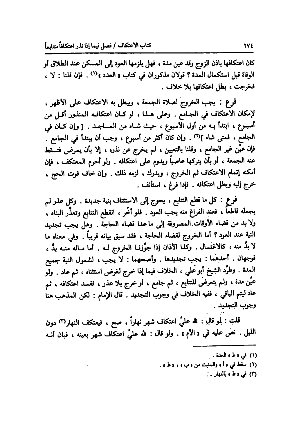 كان اعتكافها بإذن الزوج وقد عين مدة، فهل يلزمها العود إلى المسكن عند الطلاق أو الوفاة قبل استكمال المدة ؟ قولان مذكوران في كتاب العدة. فإن قلنا: لا، فخرجت، بطل اعتكافها بلا خلاف. فرع يجب الخروج لصلاة الجمعة، ويبطل به الاعتكاف على الاظهر، لامكان الاعتكاف في الجامع. وعلى هذا، لو كان اعتكافه المنذور أقل من اسبوع، ابتدأ به من أول الاسبوع، حيث شاء من المساجد. وإن كان في الجامع، فمتى شاء. وإن كان أكثر من أسبوع، وجب أن يبتدأ في الجامع. فإن عين غير الجامع، وقلنا بالتعيين، لم يخرج عن نذره، إلا بأن يمرض فتسقط عنه الجمعة، أو بأن يتركها عاصيا ويدوم على اعتكافه. ولو أحرم المعتكف، فإن أمكنه إتمام الاعتكاف ثم الخروج، ويدرك، لزمه ذلك. وإن خاف فوت الحج، خرج إليه وبطل اعتكافه، فإذا فرغ، استأنف. فرع كل ما قطع التتابع، يحوج إلى الاستئناف بنية جديدة. وكل عذر لم يجعله قاطعا، فعند الفراغ منه يجب العود. فلو أخر، انقطع التتابع وتعذر البناء، ولا بد من قضاء الاوقات المصروفة إلى ما عدا قضاء الحاجة. وهل يجب تجديد النية عند العود ؟ أما الخروج لقضاء الحاجة، فقد سبق بيانه قريبا. وفي معناه ما لا بد منه، كالاغتسال. وكذا الاذان إذا جوزنا الخروج له. أما ما له منه بد، فوجهان. أحدهما: يجب تجديدها. وأصحهما: لا يجب، لشمول النية جميع المدة. وطرد الشيخ أبو علي، الخلاف فيما إذا خرج لغرض استثناه، ثم عاد. ولو عين مدة، ولم يتعرض للتتابع، ثم جامع، أو خرج بلا عذر، ففسد اعتكافه، ثم عاد ليتم الباقي، ففيه الخلاف في وجوب التجديد. قال الامام: لكن المذهب هنا وجوب التجديد. قلت: لو قال: لله علي اعتكاف شهر نهارا، صح، فيعتكف بالنهار دون الليل. نص عليه في الام. ولو قال: لله علي اعتكاف شهر بعينه، فبان أنه