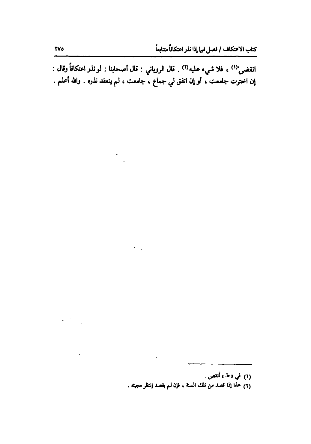 أنقضي، فلا شئ عليه. قال الروياني: قال أصحابنا: لو نذر اعتكافا وقال: إن اخترت جامعت، أو إن اتفق لي جماع، جامعت، لم ينعقد نذره. والله أعلم.