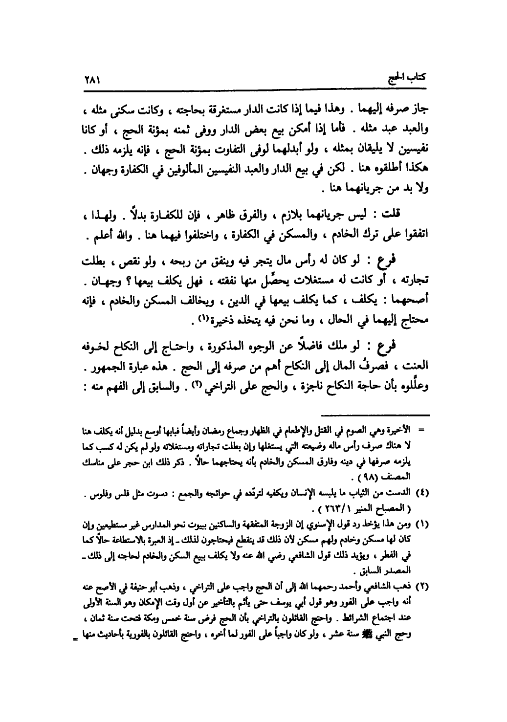 جاز صرفه إليهما. وهذا فيما إذا كانت الدار مستغرقة بحاجته، وكانت سكنى مثله، والعبد عبد مثله. فأما إذا أمكن بيع بعض الدار ووفى ثمنه بمؤنة الحج، أو كانا نفيسين لا يليقان بمثله، ولو أبدلهما لوفى التفاوت بمؤنة الحج، فإنه يلزمه ذلك. هكذا أطلقوه هنا. لكن في بيع الدار والعبد النفيسين المألوفين في الكفارة وجهان. ولا بد من جريانهما هنا. قلت: ليس جريانهما بلازم، والفرق ظاهر، فإن للكفارة بدلا. ولهذا، اتفقوا على ترك الخادم، والمسكن في الكفارة، واختلفوا فيهما هنا. والله أعلم. فرع لو كان له رأس مال يتجر فيه وينفق من ربحه، ولو نقص، بطلت تجارته، أو كانت له مستغلات يحصل منها نفقته، فهل يكلف بيعها ؟ وجهان: أصحهما: يكلف، كما يكلف بيعها في الدين، ويخالف المسكن والخادم، فإنه محتاج إليهما في الحال، وما نحن فيه يتخذه ذخيرة. فرع لو ملك فاضلا عن الوجوه المذكورة، واحتاج إلى النكاح لخوفه العنت، فصرف المال إلى النكاح أهم من صرفه إلى الحج. هذه عبارة الجمهور. وعللوه بأن حاجة النكاح ناجزة، والحج على التراخي. والسابق إلى الفهم منه: