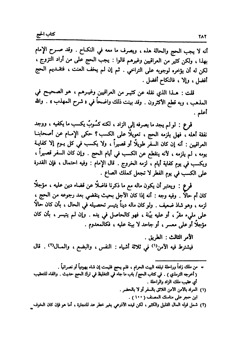 أنه لا يجب الحج والحالة هذه، ويصرف ما معه في النكاح. وقد صرح الامام بهذا، ولكن كثير من العراقيين وغيرهم قالوا: يجب الحج على من أراد التزوج، لكن له أن يؤخره لوجوبه على التراخي. ثم إن لم يخف العنت، فتقديم الحج أفضل، وإلا، فالنكاح أفضل. قلت: هذا الذي نقله عن كثير من العراقيين وغيرهم، هو الصحيح في المذهب، وبه قطع الاكثرون. وقد بينت ذلك واضحا في شرح المهذب. والله أعلم. فرع لو لم يجد ما يصرفه إلى الزاد، لكنه كسوب يكسب ما يكفيه، ووجد نفقة أهله، فهل يلزمه الحج، تعويلا على الكسب ؟ حكى الامام عن أصحابنا العراقيين: أنه إن كان السفر طويلا أو قصيرا، ولا يكسب في كل يوم إلا كفاية يومه، لم يلزمه، لانه ينقطع عن الكسب في أيام الحج. وإن كان السفر قصيرا، ويكسب في يوم كفاية أيام، لزمه الخروج. قال الامام: وفيه احتمال، فإن القدرة على الكسب في يوم الفطر لا تجعل كملك الصاع. فرع ويعتبر أن يكون ماله مع ما ذكرنا فاضلا عن قضاء دين عليه، مؤجلا كان أم حالا. وفيه وجه: أنه إذا كان الاجل بحيث ينقضي بعد رجوعه من الحج، لزمه، وهو شاذ ضعيف. ولو كان ماله دينا يتيسر تحصيله في الحال، بأن كان حالا على ملئ مقر، أو عليه بينة، فهو كالحاصل في يده. وإن لم يتيسر، بأن كان مؤجلا أو على معسر، أو جاحد لا بينة عليه، فكالمعدوم. الامر الثالث: الطريق. فيشترط فيه الامن في ثلاثة أشياء: النفس، والبضع، والمال. قال