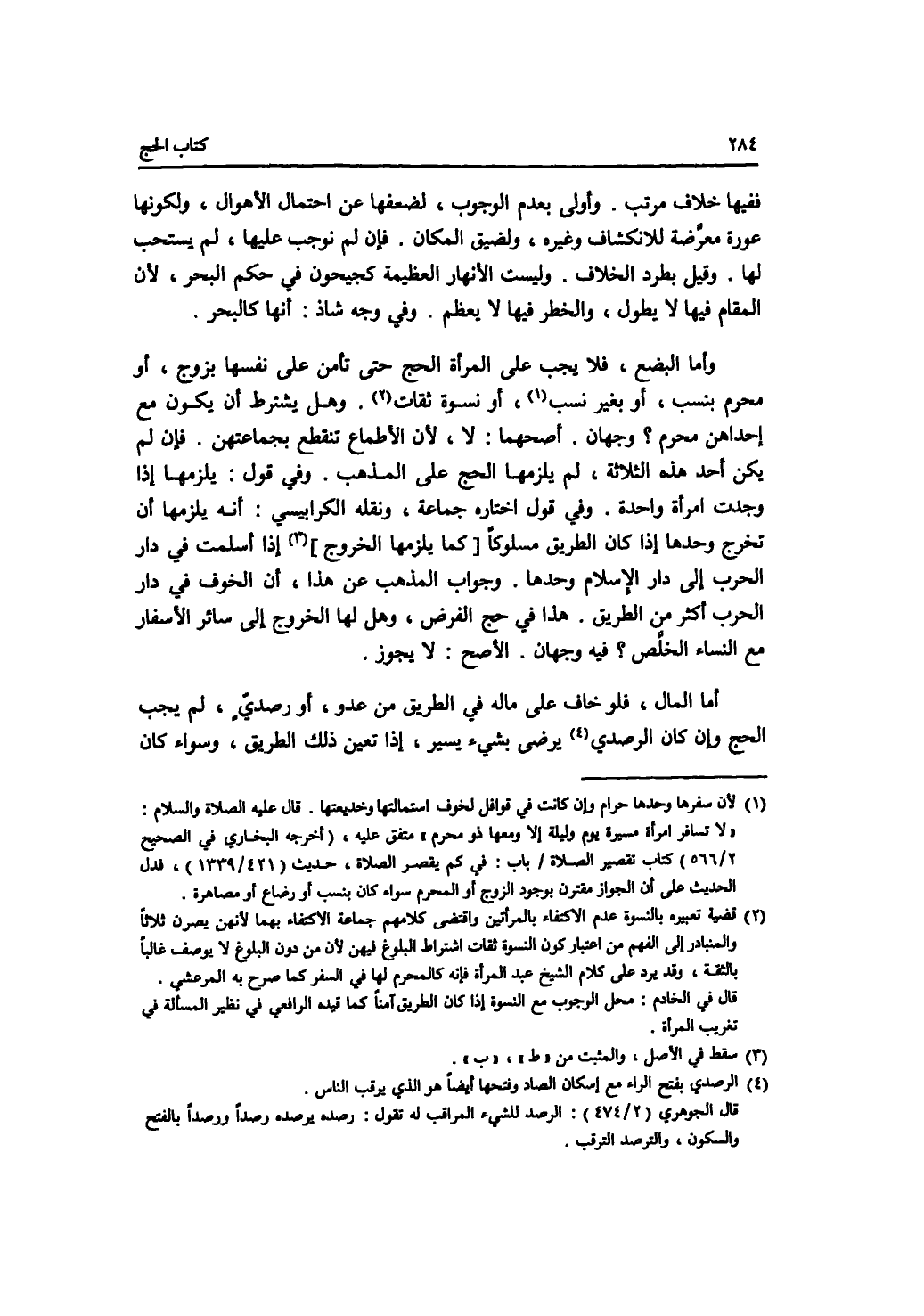 ففيها خلاف مرتب. وأولى بعدم الوجوب، لضعفها عن احتمال الاهوال، ولكونها عورة معرضة للانكشاف وغيره، لضيق المكان. فإن لم نوجب عليها، لم يستحب لها. وقيل بطرد الخلاف. وليست الانهار العظيمة كجيحون في حكم البحر، لان المقام فيها لا يطول، والخطر فيها لا يعظم. وفي وجه شاذ: أنها كالبحر. وأما البضع، فلا يجب على المرأة الحج حتى تأمن على نفسها بزوج، أو محرم بنسب، أو بغير نسب، أو نسوة ثقات. وهل يشترط أن يكون مع إحداهن محرم ؟ وجهان. أصحهما: لا، لان الاطماع تنقطع بجماعتهن. فإن لم يكن أحد هذه الثلاثة، لم يلزمها الحج على المذهب. وفي قول: يلزمها إذا وجدت امرأة واحدة. وفي قول اختاره جماعة، ونقله الكرابيسي: أنه يلزمها أن تخرج وحدها إذا كان الطريق مسلوكا، كما يلزمها الخروج إذا أسلمت في دار الحرب إلى دار الاسلام وحدها. وجواب المذهب عن هذا، أن الخوف في دار الحرب أكثر من الطريق. هذا في حج الفرض، وهل لها الخروج إلى سائر الاسفار مع النساء الخلص ؟ فيه وجهان. الاصح: لا يجوز. أما المال، فلو خاف على ماله في الطريق من عدو، أو رصدي، لم يجب الحج وإن كان الرصدي يرضى بشئ يسير، إذا تعين ذلك الطريق، وسواء كان