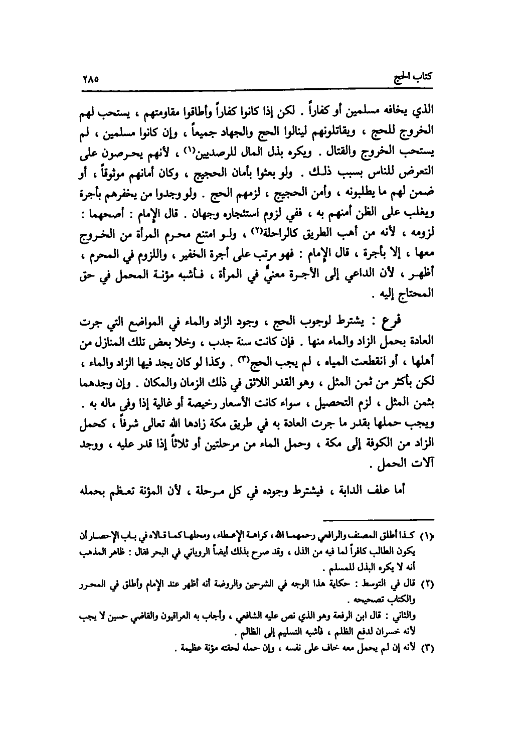 الذي يخافه مسلمين أو كفارا. لكن إذا كانوا كفارا وأطاقوا مقاومتهم، يستحب لهم الخروج للحج، ويقاتلونهم لينالوا الحج والجهاد جميعا، وإن كانوا مسلمين، لم يستحب الخروج والقتال. ويكره بذل المال للرصديين، لانهم يحرصون على التعرض للناس بسبب ذلك. ولو بعثوا بأمان الحجيج، وكان أمانهم موثوقا، أو ضمن لهم ما يطلبونه، وأمن الحجيج، لزمهم الحج. ولو وجدوا من يخفرهم بأجرة ويغلب على الظن أمنهم به، ففي لزوم استئجاره وجهان. قال الامام: أصحهما: لزومه، لانه من أهب الطريق كالراحلة. ولو امتنع محرم المرأة من الخروج معها، إلا بأجرة، قال الامام: فهو مرتب على أجرة الخفير، واللزوم في المحرم، أظهر، لان الداعي إلى الاجرة معني في المرأة، فأشبه مؤنة المحمل في حق المحتاج إليه. فرع يشترط لوجوب الحج، وجود الزاد والماء في المواضع التي جرت العادة بحمل الزاد والماء منها. فإن كانت سنة جدت، وخلا بعض تلك المنازل من أهلها، أو انقطعت المياه، لم يجب الحج. وكذا لو كان يجد فيها الزاد والماء، لكن بأكثر من ثمن المثل، وهو القدر اللائق في ذلك الزمان والمكان. وإن وجدهما بثمن المثل، لزم التحصيل، سواء كانت الاسعار رخيصة أو غالية إذا وفى ماله به. ويجب حملها بقدر ما جرت العادة به في طريق مكة زادها الله تعالى شرفا، كحمل الزاد من الكوفة إلى مكة، وحمل الماء من مرحلتين أو ثلاثا إذا قدر عليه، ووجد آلات الحمل. أما علف الدابة، فيشترط وجوده في كل مرحلة، لان المؤنة تعظم بحمله