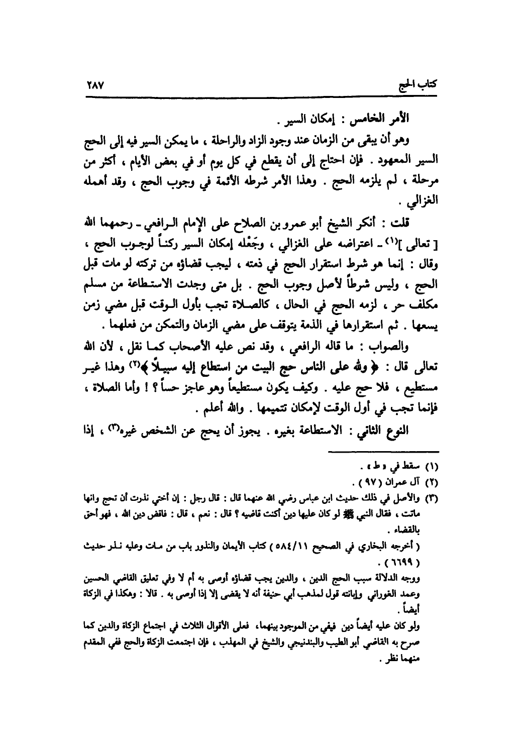 الامر الخامس: إمكان السير. وهو أن يبقى من الزمان عند وجود الزاد والراحلة، ما يمكن السير فيه إلى الحج السير المعهود. فإن احتاج إلى أن يقطع في كل يوم أو في بعض الايام، أكثر من مرحلة، لم يلزمه الحج. وهذا الامر شرطه الائمة في وجوب الحج، وقد أهمله الغزالي. قلت: أنكر الشيخ أبو عمرو بن الصلاح على الامام الرافعي - رحمهما الله - [ تعالى ] اعتراضه على الغزالي، وجعله إمكان السير ركنا لوجوب الحج، وقال: إنما هو شرط استقرار الحج في ذمته، ليجب قضاؤه من تركته لو مات قبل الحج، وليس شرطا لاصل وجوب الحج. بل متى وجدت الاستطاعة من مسلم مكلف حر، لزمه الحج في الحال، كالصلاة تجب بأول الوقت قبل مضي زمن يسعها. ثم استقرارها في الذمة يتوقف على مضي الزمان والتمكن من فعلهما. والصواب: ما قاله الرافعي، وقد نص عليه الاصحاب كما نقل، لان الله تعالى قال: * (ولله على الناس حج البيت من استطاع إليه سبيلا) * وهذا غير مستطيع، فلا حج عليه. وكيف يكون مستطيعا وهو عاجز حسا ؟ ! وأما الصلاة، فإنما تجب في أول الوقت لامكان تتميمها. والله أعلم. النوع الثاني: الاستطاعة بغيره. يجوز أن يحج عن الشخص غيره، إذا