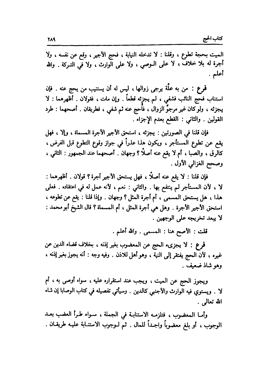 الميت بحجة تطوع، وقلنا: لا تدخله النيابة، فحج الاجير، وقع عن نفسه، ولا أجرة له بلا خلاف، لا على الوصي، ولا على الوارث، ولا في التركة. والله أعلم. فرع من به علة يرجى زوالها، ليس له أن يستنيب من يحج عنه. فإن استناب فحج النائب فشفي، لم يجزئه قطعا. وإن مات، فقولان. أظهرهما: لا يجزئه، ولو كان غير مرجو الزوال، فأحج عنه ثم شفي، فطريقان. أصحهما: طرد القولين. والجاني: القطع بعدم الاجزاء. فإن قلنا في الصورتين: يجزئه، استحق الاجير الاجرة المسماة، وإلا، فهل يقع عن تطوع المستأجر، ويكون هذا عذرا في جواز وقوع التطوع قبل الفرض، كالرق، والصبا، أم لا يقع عنه أصلا ؟ وجهان. أصحهما عند الجمهور: الثاني، وصحح الغزالي الاول. فإن قلنا: لا يقع عنه أصلا، فهل يستحق الاجير أجرة ؟ قولان. أظهرهما: لا، لان المستأجر لم ينتفع بها. والثاني: نعم، لانه عمل له في اعتقاده فعلى هذا، هل يستحق المسمى، أم أجرة المثل ؟ وجهان. وإذا قلنا: يقع عن تطوعه، استحق الاجير الاجرة. وهل هي أجرة المثل، أم المسماة ؟ قال الشيخ أبو محمد: لا يبعد تخريجه على الوجهين. قلت: الاصح هنا: المسمى. والله أعلم. فرع لا يجزئ الحج عن المعضوب بغير إذنه، بخلاف قضاء الدين عن غيره، لان الحج يفتقر إلى النية، وهو أهل للاذن. وفيه وجه: أنه يجوز بغير إذنه، وهو شاذ ضعيف. ويجوز الحج عن الميت، ويجب عند استقراره عليه، سواء أوصى به، أم لا. ويستوي فيه الوارث والاجنبي كالدين. وسيأتي تفصيله في كتاب الوصايا إن شاء الله تعالى. وأما المعضوب، فتلزمه الاستنابة في الجملة، سواء طرأ العضب بعد الوجوب أو بلغ معضوبا واجدا للمال. ثم لوجوب الاستنابة عليه طريقان.