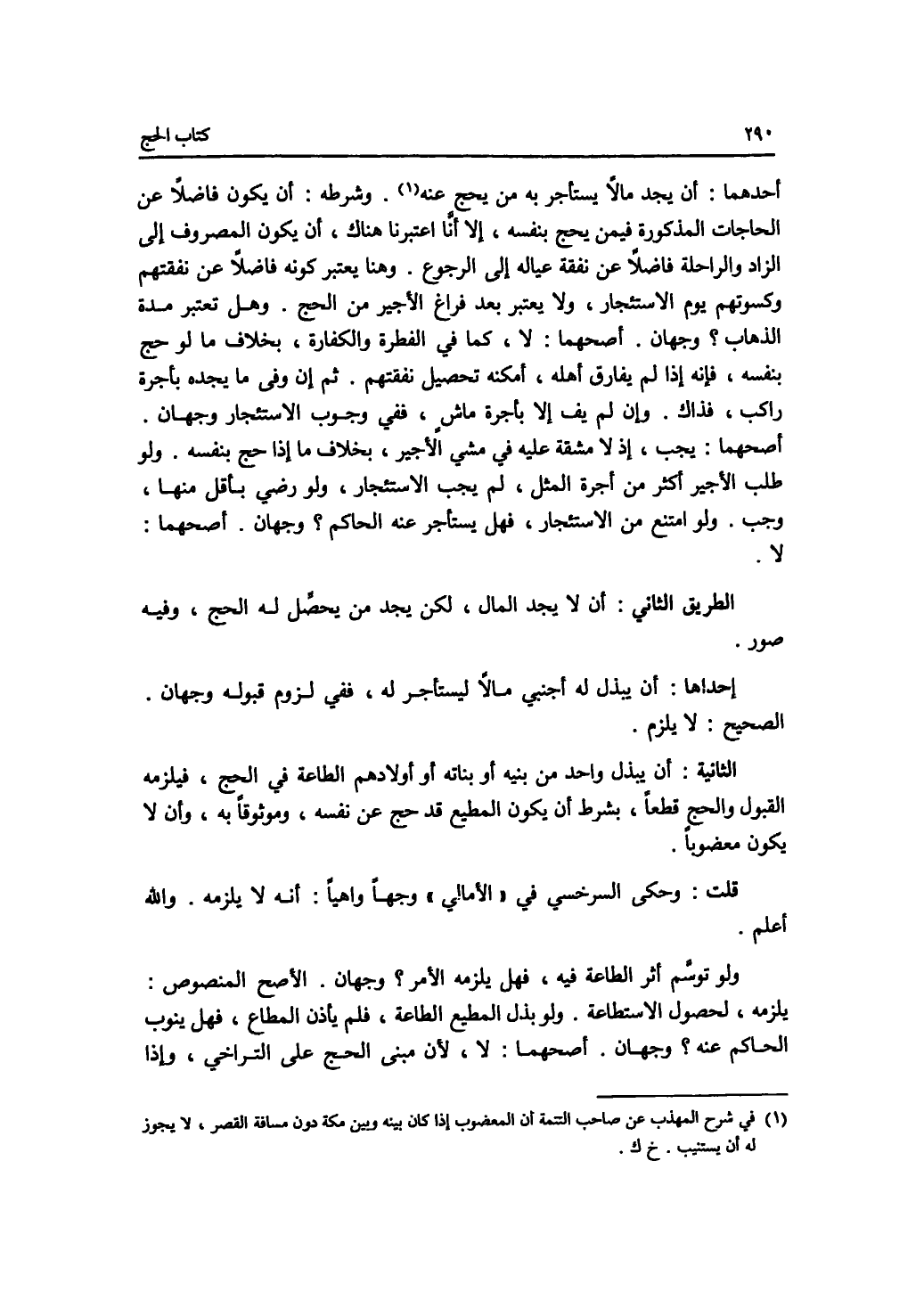 أحدهما: أن يجد مالا يستأجر به من يحج عنه. وشرطه: أن يكون فاضلا عن الحاجات المذكورة فيمن يحج بنفسه، إلا أنا اعتبرنا هناك، أن يكون المصروف إلى الزاد والراحلة فاضلا عن نفقة عياله إلى الرجوع. وهنا يعتبر كونه فاضلا عن نفقتهم وكسوتهم يوم الاستئجار، ولا يعتبر بعد فراغ الاجير من الحج. وهل تعتبر مدة الذهاب ؟ وجهان. أصحهما: لا، كما في الفطرة والكفارة، بخلاف ما لو حج بنفسه، فإنه إذا لم يفارق أهله، أمكنه تحصيل نفقتهم. ثم إن وفى ما يجده بأجرة راكب، فذاك. وإن لم يف إلا بأجرة ماش، ففي وجوب الاستئجار وجهان. أصحهما: يجب، إذ لا مشقة عليه في مشي الاجير، بخلاف ما إذا حج بنفسه. ولو طلب الاجير أكثر من أجرة المثل، لم يجب الاستئجار، ولو رضي بأقل منها، وجب. ولو امتنع من الاستئجار، فهل يستأجر عنه الحاكم ؟ وجهان. أصحهما: لا. الطريق الثاني: أن لا يجد المال، لكن يجد من يحصل له الحج، وفيه صور. إحداها: أن يبذل له أجنبي مالا ليستأجر له، ففي لزوم قبوله وجهان. الصحيح: لا يلزم. الثانية: أن يبذل واحد من بنيه أو بناته أو أولادهم الطاعة في الحج، فيلزمه القبول والحج قطعا، بشرط أن يكون المطيع قد حج عن نفسه، وموثوقا به، وأن لا يكون معضوبا. قلت: وحكى السرخسي في الامالي وجها واهيا: أنه لا يلزمه. والله أعلم. ولو توسم أثر الطاعة فيه، فهل يلزمه الامر ؟ وجهان. الاصح المنصوص: يلزمه، لحصول الاستطاعة. ولو بذل المطيع الطاعة، فلم يأذن المطاع، فهل ينوب الحاكم عنه ؟ وجهان. أصحهما: لا، لان مبنى الحج على التراخي، وإذا