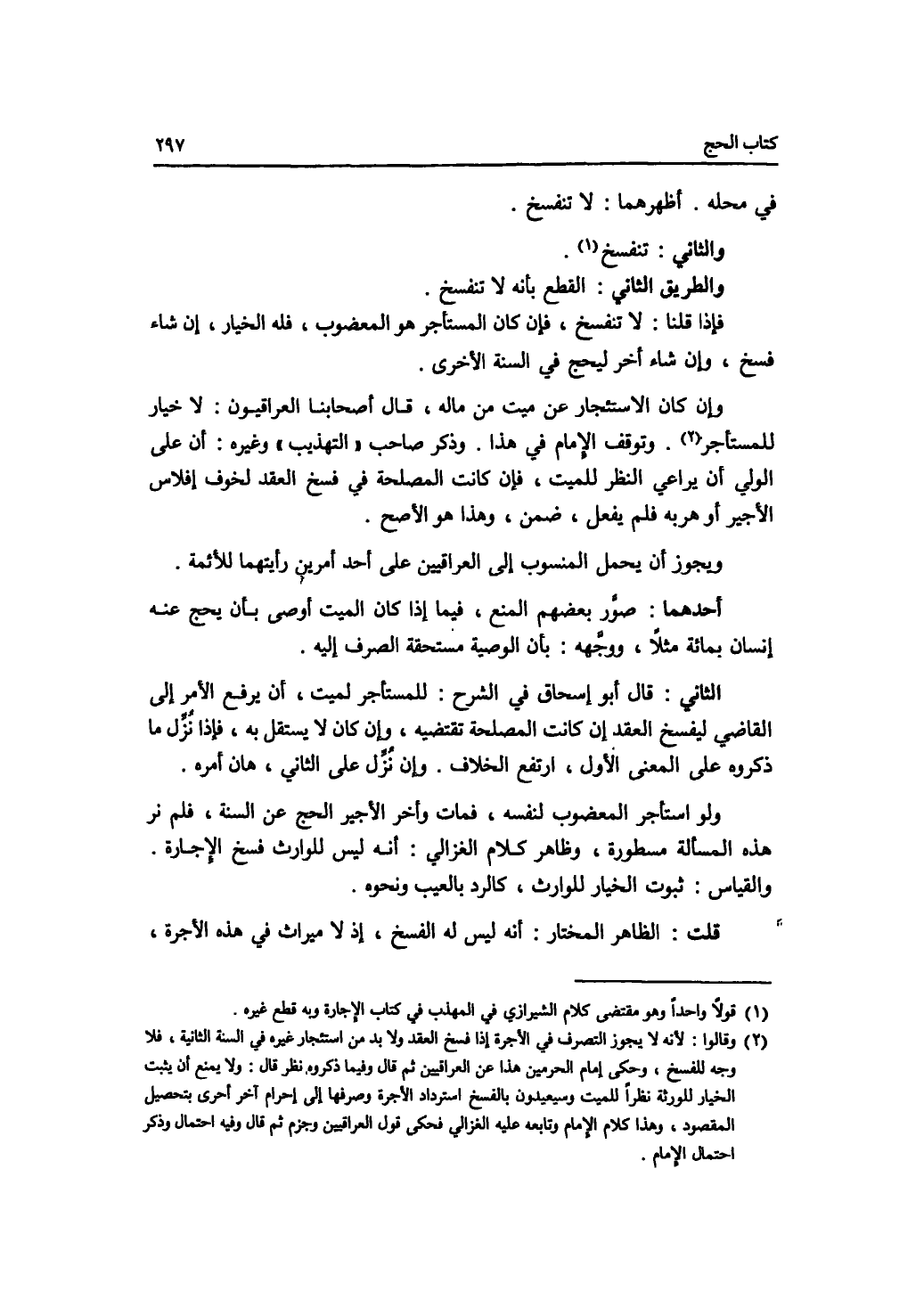 في محله. أظهرهما: لا تنفسخ. والثاني: تنفسخ. والطريق الثاني: القطع بأنه لا تنفسخ. فإذا قلنا: لا تنفسخ، فإن كان المستأجر هو المعضوب، فله الخيار، إن شاء فسخ، وإو شاء إخبر ليحج في السنة الاخرى. وإن كان الاستئجار عن منيت من ماله، قال أصحابنا العراقيون: لا خيار للمستأجر. وتوقف الامام في هذا. وذكر صاحب " التهذيب " وغيره: أن على الولي أن يراعي النظر للميت، فإن كانت المصلحة في فسخ العقد لخوف إفلاس الاجير أو هربه فلم يفعل، ضمن، وهذا هو الاصح. ويجوز أن يحمل المنسوب إلى العراقيين على أحد أمرين رأيتهما للائمة. أحدهما: صور بعضهم المنع، فيما إذا كان الميت أوصى بأن يحج عنه إنسان بمائة مثلا، ووجهه: بأن الوصية مستحقة الصرف إليه. الثاني: قال أبو إسحاق في الشرح: للمستأجر لميت، أن يرفع الامر إلى القاضى ليفسخ العقد إن كانت المصلحة تقتضيه، وإن كان لا يستقل به، فإذا نزل من ذكروه على المعنى الاول، ارتفع الخلاف. وإن نزل على الثاني، هان أمره. ولو استأجر المعضوب لنفسه، فمات وأخر الاجير الحج عن السنة، فلم نر هذه المسألة مسطورة، وظاهر كلام الغزالي: أنه ليس للوارث فسخ الاجارة. والقياس: ثبوت الخيار للوارث، كالرد بالعيب ونحوه. قلت: الظاهر المختار: أنه ليس له الفسخ، إذ لا ميراث في هذه الاجرة،