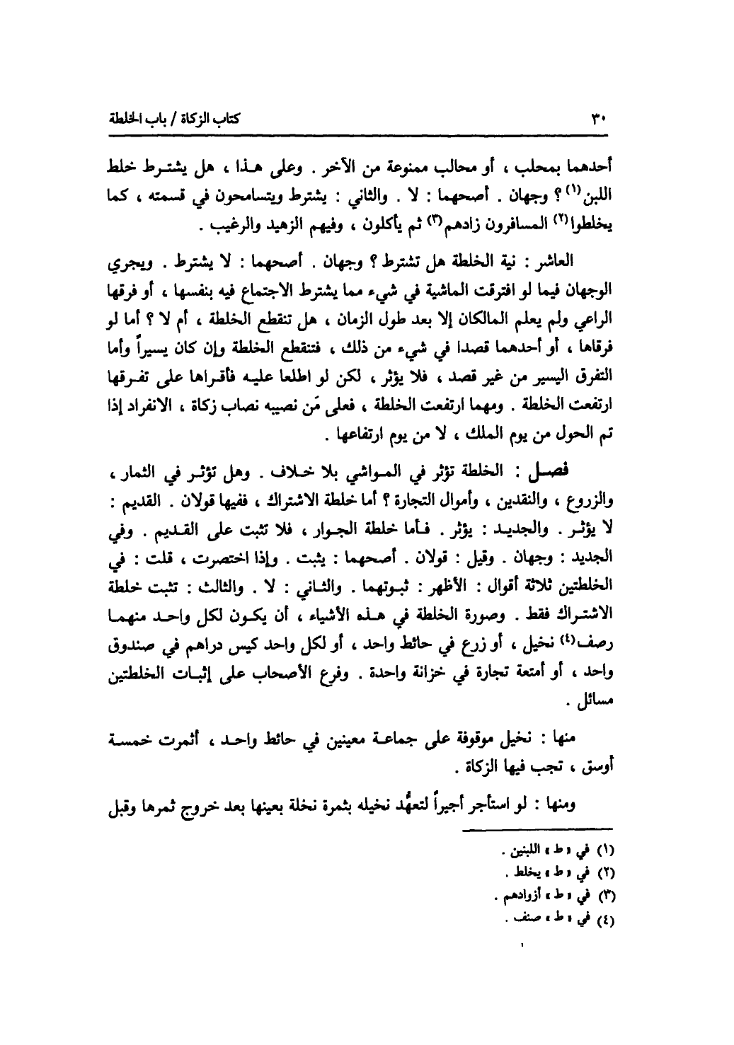 أحدهما بمحلب، أو محالب ممنوعة من الآخر. وعلى هذا، هل يشترط جلط اللبن ؟ وجهان. أصحهما: لا. والثاني: يشترط ويتسامحون في قسمته، كما يخلطوا المسافرون أزوادهم ثم يأكلون، وفيهم الزهيد والرغيب. العاشر: نية الخلطة هل تشترط ؟ وجهان. أصحهما: لا يشترط. ويجري الوجهان فيما لو افترقت الماشية في شئ مما يشترط الاجتماع فيه بنفسها، أو فرقها الراعي ولم يعلم المالكان إلا بعد طول الزمان، هل تنقطع الخلطة، أم لا ؟ أما لو فرقاها، أو أحدهما قصدا في شئ من ذلك، فتنقطع الخلطة وإن كان يسيرا. وأما التفرق اليسير من غير قصد، فلا يؤثر، لكن لو اطلعا عليه فأقراها على تفرقها ارتفعت الخلطة. ومهما ارتفعت الخلطة، فعلى من نصيبه نصاب زكاة، الانفراد إذا تم الحول من يوم الملك، لا من يوم ارتفاعها. فصل الخلطة تؤثر في المواشي بلا خلاف. وهل تؤثر في الثمار، والزروع، والنقدين، وأموال التجارة ؟ أما خلطة الاشتراك، ففيها قولان. القديم: لا يؤثر. والجديد: يؤثر. فأما خلطة الجوار، فلا تثبت على القديم. وفي الجديد: وجهان. وقيل: قولان. أصحهما: يثبت. إذا اختصرت، قلت: في الخلطتين ثلاثة أقوال: الاظهر: ثبوتهما. والثاني: لا. والثالث: تثبت خلطة الاشتراك فقط. وصورة الخلطة في هذه الاشياء، أن يكون لكل واحد منهما رصف نخيل، أو زرع في حائط واحد، أو لكل واحد كيس درهم في صندوق واحد، أو أمتعة تجارة في خزانة واحدة. وفرع الاصحاب على إثبات الخلطتين مسائل. منها: نخيل موقوفة على جماعة معينين في حائط واحد، أثمرت خمسة أوسق، تجب فيها الزكاة. ومنها: لو استأجر أجيرا لتعهد نخيله بثمرة نخلة بعينها بعد خروج ثمرها وقبل