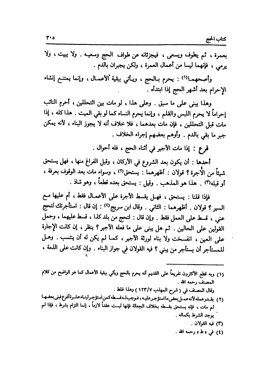 بعمرة، ثم يطوف ويسعى، فيجزئانه عن طواف الحج وسعيه. ولا يبيت، ولا يرمي، فإنهما ليسا من أعمال العمرة، ولكن يجبران بالدم. وأصحهما: يحرم بالحج، ويأتي ببقية الاعمال، وإنما يمتنع إنشاء الاحرام بعد أشهر الحج إذا ابتدأه، وهذا يبنى على ما سبق. وعلى هذا، لو مات بين التحللين، أحرم النائب إحراما لا يحرم اللبس والقلم، وإنما يحرم النساء كما لو بقي الميت. هذا كله، إذا مات قبل التحللين، فإن مات بعدهما، فلا خلاف أنه لا يجوز البناء، لانه يمكن جبر ما بقي بالدم. وأوهم بعضهم إجراء الخلاف فيه. فرع إذا مات الاجير في أثناء الحج، فله أحوال. أحدها: أن يكون بعد الشروع في الاركان، وقبل الفراغ منها، فهل يستحق شيئا من الاجرة ؟ قولان. أظهرهما: يستحق، وسواء مات بعد الوقوف بعرفة، أو قبله. هذا هو المذهب. وقيل: يستحق بعده قطعا، وهو شاذ. فإذا قلنا: يستحق، فهل يقسط الاجرة على الاعمال فقط، أم عليها مع السير ؟ قولان. أظهرهما: الثاني. وقال ابن سريج رحمه الله: إن قال: استأجرتك لتحج عني، قسط على العمل فقط. وإن قال: لتحج من بلد كذا، قسط عليهما، وحمل القولين على الحالين. ثم هل يبنى على ما فعله الاجير ؟ ينظر، إن كانت الاجارة على العين، انفسخت ولا بناء لورثة الاجير، كما لم يكن له أن ينتسب، وهل للمستأجر أن يستأجر من يبني ؟ فيه القولان في جواز البناء. وإن كانت على الذمة