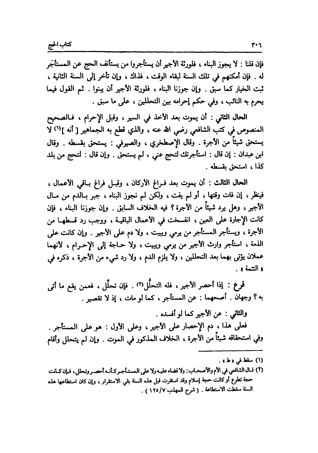 فإن قلنا: لا يجوز البناء، فلورثة الاجير أن يستأجروا من يستأنف الحج عن المستأجر له. فإن أمكنهم في تلك السنة لبقاء الوقت، فذاك، وإن تأخر إلى السنة الثانية، ثبت الخيار كما سبق. وإن جوزنا البناء، فلورثة الاجير أن يبنوا. ثم القول فيما يحرم به النائب، وفي حكم إحرامه بين التحللين، على ما سبق. الحال الثاني: أن يموت بعد الاخذ في السير، وقبل الاحرام، فالصحيح المنصوص في كتب الشافعي رضي الله عنه، والذي قطع به الجماهير: لا يستحق شيئا من الاجرة. وقال الاصطخري، والصيرفي: يستحق بقسطه. وقال ابن عبدان: إن قال: استأجرتك لتحج عني، لم يستحق. وإن قال: لتحج من بلد كذا، استحق بقسطه. الحال الثالث: أن يموت بعد فراغ الاركان، وقبل فراغ باقي الاعمال، فينظر، إن فات وقتها، أو لم يفت، ولكن لم نجوز البناء، جبر بالدم من مال الاجير، وهل يرد شيئا من الاجرة ؟ فيه الخلاف السابق. وإن جوزنا البناء، فإن كانت الاجارة على العين، انفسخت في الاعمال الباقية، ووجب رد قسطها من الاجرة، ويستأجر المستأجر من يرمي ويبيت، ولا دم على الاجير. وإن كانت على الذمة، استأجر وارث الاجير من يرمي ويبيت، ولا حاجة إلى الاحرام، لانهما عملان يؤتى بهما بعد التحللين، ولا يلزم الدم، ولا رد شئ من الاجرة، ذكره في التتمة. فرع إذا أحصر الاجير، فله التحلل. فإن تحلل، فعمن يقع ما أتى به ؟ وجهان. أصحهما: عن المستأجر، كما لو مات، إذ لا تقصير. والثاني: عن الاجير كما لو أفسده. فعلى هذا، دم الاحصار على الاجير، وعلى الاول: هو على المستأجر. وفي استحقاقه شيئا من الاجرة، الخلاف المذكور في الموت. وإن لم يتحلل وأقام