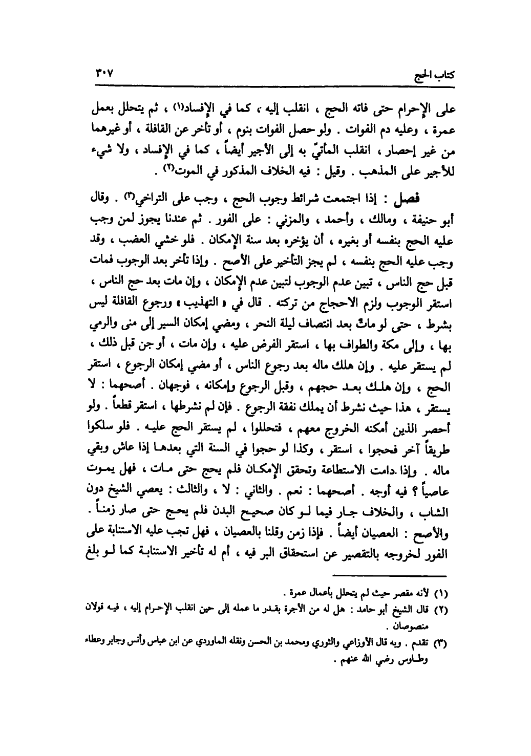 على الاحرام حتى فاته الحج، انقلب إليه، كما في الافساد، ثم يتحلل بعمل عمرة، وعليه دم الفوات. ولو حصل الفوات بنوم، أو تأخر عن القافلة، أو غيرهما من غير إحصار، انقلب المأتي به إلى الاجير أيضا، كما في الافساد، ولا شئ للاجير على المذهب. وقيل: فيه الخلاف المذكور في الموت. فصل إذا اجتمعت شرائط وجوب الحج، وجب على التراخي. وقال أبو حنيفة، ومالك، وأحمد، والمزني: على الفور. ثم عندنا يجوز لمن وجب عليه الحج بنفسه أو بغيره، أن يؤخره بعد سنة الامكان. فلو خشي العضب، وقد وجب عليه الحج بنفسه، لم يجز التأخير على الاصح. وإذا تأخر بعد الوجوب فمات قبل حج الناس، تبين عدم الوجوب لتبين عدم الامكان، وإن مات بعد حج الناس، استقر الوجوب ولزم الاحجاج من تركته. قال في التهذيب ورجوع القافلة ليس بشرط، حتى لو مات بعد انتصاف ليلة النحر، ومضي إمكان السير إلى منى والرمي بها، وإلى مكة والطواف بها، استقر الفرض عليه، وإن مات، أو جن قبل ذلك، لم يستقر عليه. وإن هلك ماله بعد رجوع الناس، أو مضي إمكان الرجوع، استقر الحج، وإن هلك بعد حجهم، وقبل الرجوع وإمكانه، فوجهان. أصحهما: لا يستقر. هذا حيث نشرط أن يملك نفقة الرجوع. فإن لم نشرطها، استقر قطعا. ولو أحصر الذين أمكنه الخروج معهم، فتحللوا، لم يستقر الحج عليه. فلو سلكوا طريقا آخر فحجوا، استقر، وكذا لو حجوا في السنة التي بعدها إذا عاش وبقي ماله. وإذا دامت الاستطاعة وتحقق الامكان فلم يحج حتى مات، فهل يموت عاصيا ؟ فيه أوجه. أصحهما: نعم. والثاني: لا، والثالث: يعصي الشيخ دون الشاب، والخلاف جار فيما لو كان صحيح البدن فلم يحج حتى صار زمنا. والاصح: العصيان أيضا. فإذا زمن وقلنا بالعصيان، فهل تجب عليه الاستنابة على الفور لخروجه بالتقصير عن استحقاق البر فيه، أم له تأخير الاستنابة كما لو بلغ