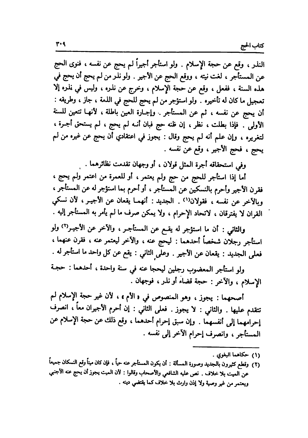 النذر، وقع عن حجة الاسلام. ولو استأجر أجيرا لم يحج عن نفسه، فنوى الحج عن المستأجر، لغت نيته، ووقع الحج عن الاجير. ولو نذر من لم يحج أن يحج في هذه السنة، ففعل، وقع عن حجة الاسلام، وخرج عن نذره، وليس في نذره إلا تعجيل ما كان له تأخيره. ولو استؤجر من لم يحج للحج في الذمة، جاز، وطريقه: أن يحج عن نفسه، ثم عن المستأجر. وإجارة العين باطلة، لانها تتعين للسنة الاولى. فإذا بطلت، نظر، إن ظنه حج فبان أنه لم يحج، لم يستحق أجره، لتغريره، وإن علم أنه لم يحج وقال: يجوز في اعتقادي أن يحج عن غيره من لم يحج، فحج الاجير، وقع عن نفسه. وفي استحقاقه أجرة المثل قولان، أو وجهان تقدمت نظائرهما. أما إذا استأجر للحج من حج ولم يعتمر، أو للعمرة من اعتمر ولم يحج، فقرن الاجير وأحرم بالنسكين عن المستأجر، أو أحرم بما استؤجر له عن المستأجر، وبالآخر عن نفسه، فقولان. الجديد: أنهما يقعان عن الاجير، لان نسكي القران لا يفترقان، لاتحاد الاحرام، ولا يمكن صرف ما لم يأمر به المستأجر إليه. والثاني: أن ما استؤجر له يقع عن المستأجر، والآخر عن الاجير. ولو استأجر رجلان شخصا، أحدهما: ليحج عنه، والآخر ليعتمر عنه، فقرن عنهما، فعلى الجديد: يقعان عن الاجير. وعلى الثاني: يقع عن كل واحد ما استأجر له. ولو استأجر المعضوب رجلين ليحجا عنه في سنة واحدة، أحدهما: حجة الاسلام، والآخر: حجة قضاء أو نذر، فوجهان. أصحهما: يجوز، وهو المنصوص في الام، لان غير حجة الاسلام لم تتقدم عليها. والثاني: لا يجوز. فعلى الثاني: إن أحرم الاجيران معا، انصرف إحرامهما إلى أنفسهما. وإن سبق إحرام أحدهما، وقع ذلك عن حجة الاسلام عن المستأجر، وانصرف إحرام الآخر إلى نفسه.