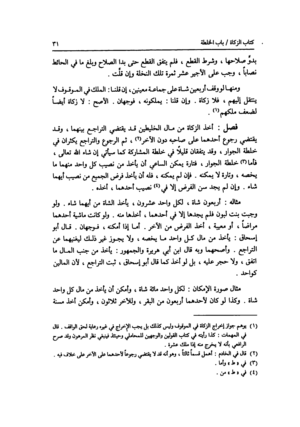 بدو صلاحها، وشرط القطع، فلم يتفق القطع حتى بدا الصلاح وبلغ ما في الحائط نصابا، وجب على الاجير عشر ثمرة تلك النخلة وإن قلت. ومنها لو وقف أربعين شاة على جماعة معينين، إن قلنا: الملك في الموقوف لا ينتقل إليهم، فلا زكاة. وإن قلنا: يملكونه، فوجهان. الاصح: لا زكاة أيضا لضعف ملكهم. فصل أخذ الزكاة من مال الخليطين قد يقتضي التراجع بينهما، وقد يقتضي رجوع أحدهما على صاحبه دون الآخر، ثم الرجوع والتراجع يكثران في خلطة الجوار، وقد يتفقان قليلا في خلطة المشاركة كما سيأتي إن شاء الله تعالى. فأما خلطة الجوار، فتارة يمكن الساعي أن يأخذ من نصيب كل واحد منهما ما يخصه، وتارة لا يمكنه. فإن لم يمكنه، فله أن يأخذ فرض الجميع من نصيب أيهما شاء. وإن لم يجد سن الفرض إلا من نصيب أحدهما، أخذه. مثاله: أربعون شاة، لكل واحد عشرون، يأخذ الشاة من أيهما شاء. ولو وجبت بنت لبون فلم يجدها إلا في أحدهما، أخذها منه. ولو كانت ماشية أحدهما مراضا، أو معيبة، أخذ الفرض من الآخر. أما إذا أمكنه، فوجهان. قال أبو إسحاق: يأخذ من مال كل واحد ما يخصه، ولا يجوز غير ذلك ليغنيهما عن التراجع. وأصحهما وبه قال ابن أبي هريرة والجمهور: يأخذ من جنب المال ما اتفق، ولا حجر عليه، بل لو أخذ كما قال أبو إسحق، ثبت التراجع، لان المالين كواحد. مثال صورة الامكان: لكل واحد مائة شاة، وأمكن أن يأخذ من مال كل واحد شاة. وكذا لو كان لاحدهما أربعون من البقر، وللآخر ثلاثون، وأمكن أخذ مسنة