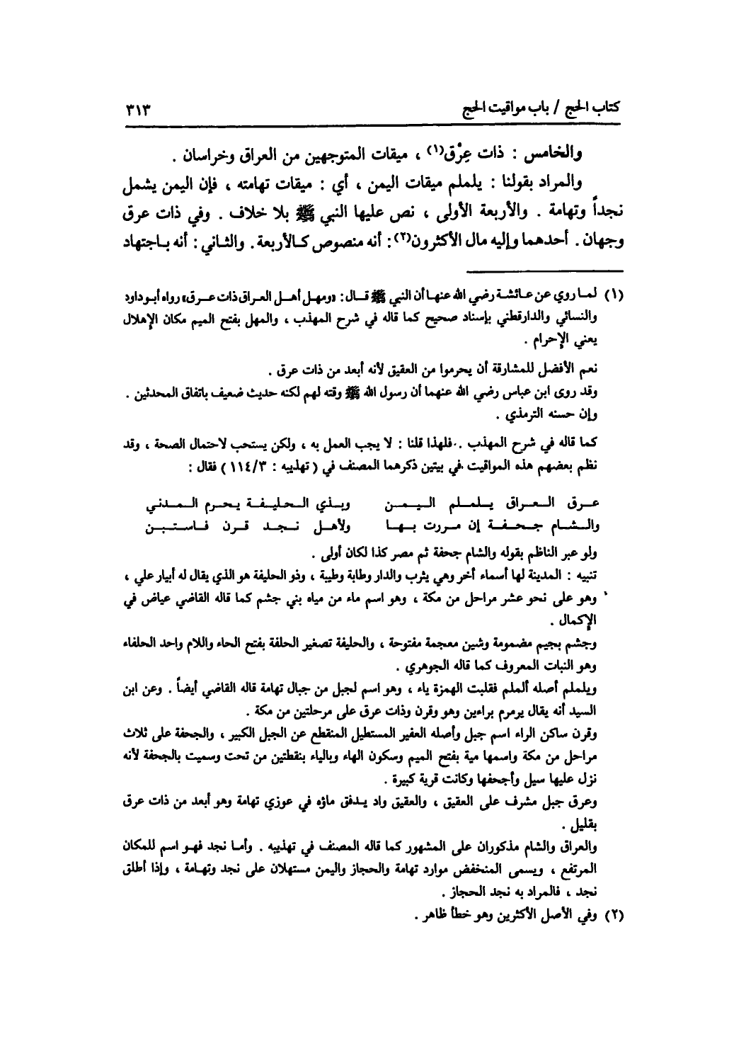 والخامس: ذات عرق، ميقات المتوجهين من العراق وخراسان. والمراد بقولنا: يلملم ميقات اليمن، أي: ميقات تهامته، فإن اليمن يشمل نجدا وتهامة. والاربعة الاولى، نص عليها النبي - صلى الله عليه وسلم - بلا خلاف. وفي ذات عرق وجهان. أحدهما وإليه مال الاكثرون: أنه منصوص كالاربعة. والثاني: أنه باجتهاد