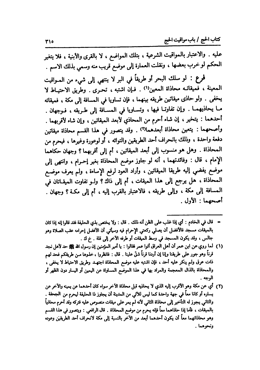 عليه. والاعتبار بالمواقيت الشرعية، بتلك المواضع، لا بالقرى والابنية، فلا يتغير الحكم لو خرب بعضها، ونقلت العمارة إلى موضع قريب منه وسمي بذلك الاسم. فرع لو سلك البحر أو طريقا في البر لا ينتهي إلى شئ من المواقيت المعينة، فميقاته محاذاة المعين. فإن اشتبه، تحرى. وطريق الاحتياط لا يخفى. ولو حاذى ميقاتين طريقه بينهما، فإن تساويا في المسافة إلى مكة، فميقاته ما يحاذيهما. وإن تفاوتا فيها، وتساويا في المسافة إلى طريقه، فوجهان. أحدهما: يتخير، إن شاء أحرم من المحاذي لابعد الميقاتين، وإن شاء لاقربهما. وأصحهما: يتعين محاذاة أبعدهما. وقد يتصور في هذا القسم محاذاة ميقاتين دفعة واحدة، وذلك بانحراف أحد الطريقين والتوائه، أو لو عورة وغيرها، فيحرم من المحاذاة. وهل هو منسوب إلى أبعد الميقاتين، أم إلى أقربهما ؟ وجهان حكاهما الامام، قال: وفائدتهما، أنه لو جاوز موضع المحاذاة بغير إحرام، وانتهى إلى موضع يفضي إليه طريقا الميقاتين، وأراد العود لرفع الاساءة، ولم يعرف موضع المحاذاة، هل يرجع إلى هذا الميقات، أم إلى ذاك ؟ ولو تفاوت الميقاتان في المسافة إلى مكة، وإلى طريقه، فالاعتبار بالقرب إليه، أم إلى مكة ؟ وجهان. أصحهما: الاول.