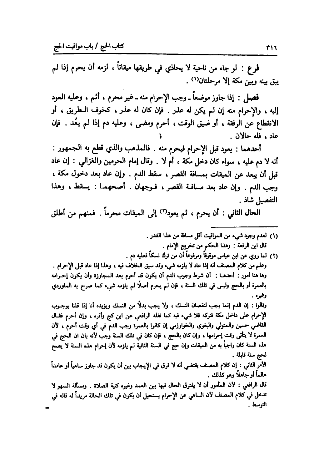 فرع لو جاء من ناحية لا يحاذي في طريقها ميقاتا، لزمه أن يحرم إذا لم يبق بينه وبين مكة إلا مرحلتان. فصل إذا جاوز موضعا - وجب الاحرام منه - غير محرم، أثم، وعليه العود إليه، والاحرام منه إن لم يكن له عذر. فإن كان له عذر، كخوف الطريق، أو الانقطاع عن الرفقة، أو ضيق الوقت، أحرم ومضى، وعليه دم إذا لم يعد. فإن عاد، فله حالان. أحدهما: يعود قبل الاحرام فيحرم منه. فالمذهب والذي قطع به الجمهور: أنه لا دم عليه، سواء كان دخل مكة، أم لا. وقال إمام الحرمين والغزالي، إن عاد قبل أن يبعد عن الميقات بمسافة القصر، سقط الدم. وإن عاد بعد دخول مكة، وجب الدم. وإن عاد بعد مسافة القصر، فوجهان. أصحهما: يسقط، وهذا التفصيل شاذ. الحال الثاني: أن يحرم، ثم يعود إلى الميقات محرما. فمنهم من أطلق