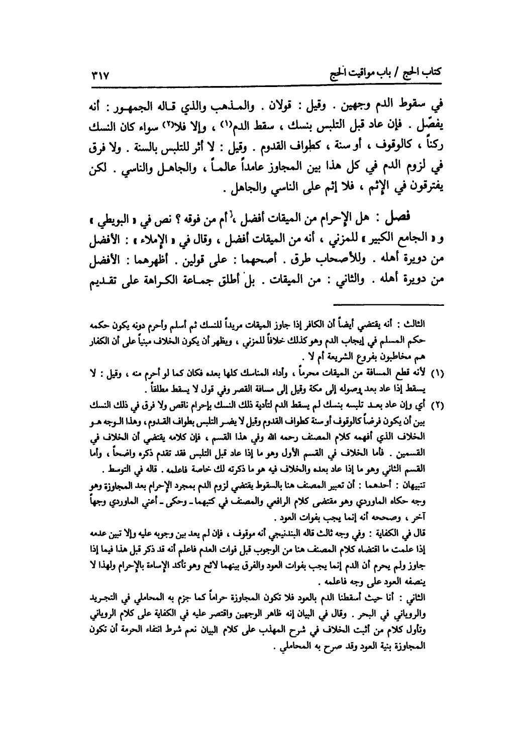 في سقوط الدم وجهين. وقيل: قولان. والمذهب والذي قاله الجمهور: أنه يفصل. فإن عاد فبل التلبس بنسك، سقط الدم، وإلا فلا، سواء كان النسك ركنا، كالوقوف، أو سنة، كطواف القدوم. وقيل: لا أثر للتلبس بالسنة. ولا فرق في لزوم الدم في كل هذا بين المجاوز عامدا عالما، والجاهل والناسي. لكن يفترقون في الاثم، فلا إثم على الناس والجاهل. فصل هل الاحرام من الميقات أفضل، أم من فوقه ؟ نص في البويطي والجامع الكبير للمزني، أنه من الميقات أفضل، وقال في الاملاء: الافضل من دويرة أهله. وللاصحاب طرق. أصحهما: على قولين. أظهرهما: الافضل من دويرة أهله. والثاني: من الميقات. بل أطلق جماعة الكراهة على تقديم
