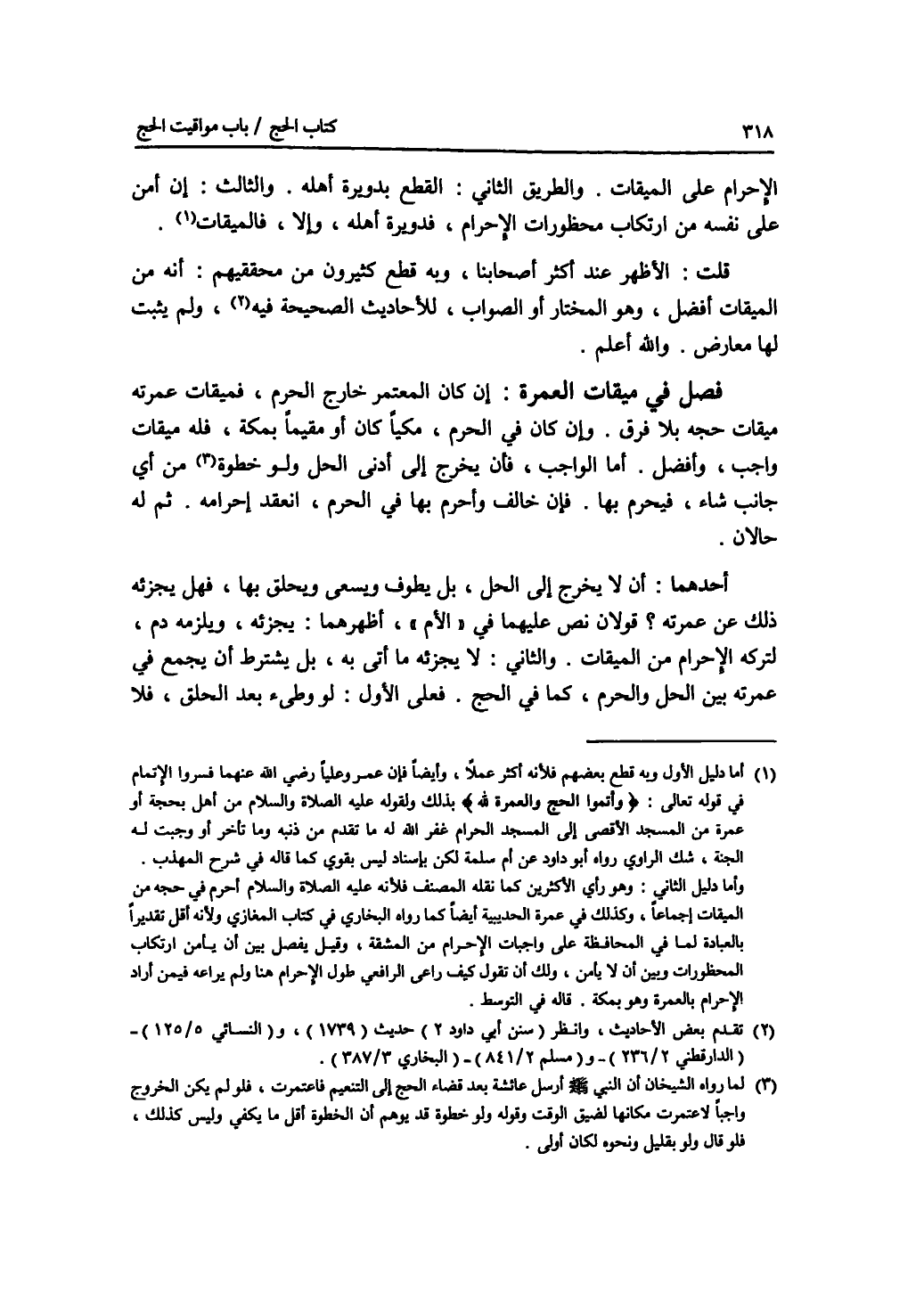 الاحرام على الميقات. والطريق الثاني: القطع بدويرة أهله. والثالث: إن أمن على نفسه من ارتكاب محظورات الاحرام، فدويرة أهله، وإلا، فالميقات. قلت: الاظهر عند أكثر أصحابنا، وبه قطع كثيرون من محققيهم: أنه من الميقات أفضل، وهو المختار أو الصواب، للاحاديث الصحيحة فيه، ولم يثبت لها معارض. والله أعلم. فصل في ميقات العمرة إن كان المعتمر خارج الحرم، فميقات عمرته ميقات حجه بلا فرق. وإن كان في الحرم، مكيا كان أو مقيما بمكة، فله ميقا واجب، وأفضل. أما الواجب، فأن يخرج إلى أدنى الحل ولو خطوة من أي جانب شاء، فيحرم بها. فإن خالف وأحرم بها في الحرم، انعقد إحرامه. ثم له حالان. أحدهما: أن لا يخرج إلى الحل، بل يطوف ويسعى ويحلق بها، فهل يجزئه ذلك عن عمرته. قولان نص عليهما في الام، أظهرهما: يجزئه، ويلزمه دم، لتركه الاحرام من الميقات. والثاني: لا يجزئه ما أتى به، بل يشترط أن يجمع في عمرته بين الحل والحرم، كما في الحج. فعلى الاول: لو وطئ بعد الحلق، فلا