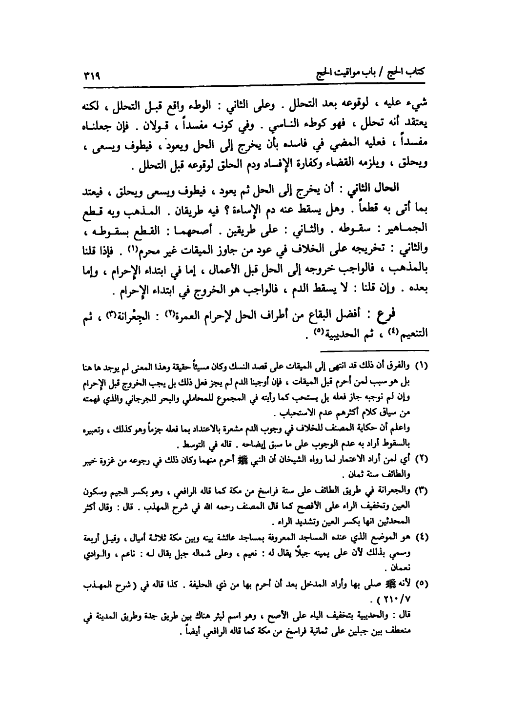 شئ عليه، لوقوعه بعد التحلل. وعلى الثاني: الوطئ واقع قبل التحلل، لكنه يعتقد أنه تحلل، فهو كوطئ الناسي. وفي كونه مفسدا، قولان. فإن جعلناه مفسدا، فعليه المضي في فاسده بأن يخرج إلى الحل ويعود، فيطوف ويسعى، ويحلق، ويلزمه القضاء وكفارة الافساد ودم الحلق لوقوعه قبل التحلل. الحال الثاني: أن يخرج إلى الحل ثم يعود، فيطوف ويسعى ويحلق، فيعتد بما أتى به قطعا. وهل يسقط عنه دم الاساءة ؟ فيه طريقان. المذهب وبه قطع الجماهير: سقوطه. والثاني: على طريقين. أصحهما: القطع بسقوطه، والثاني: تخريجه على الخلاف في عود من جاوز الميقات غير محرم. فإذا قلنا بالمذهب، فالواجب خروجه إلى الحل قبل الاعمال، إما في ابتداء الاحرام، وإما بعده. وإن قلنا: لا يسقط الدم، فالواجب هو الخروج في ابتداء الاحرام. فرع أفضل البقاع من أطراف الحل لاحرام العمرة: الجعرانة، ثم التنعيم، ثم الحديبية.