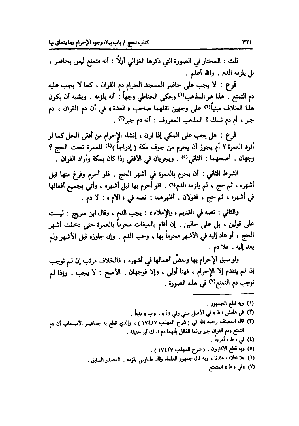 قلت: المختار في الصورة التي ذكرها الغزالي أولا: أنه متمتع ليس بحاضر، بل يلزمه الدم. والله أعلم. فرع لا يجب على حاضر المسجد الحرام دم القران، كما لا يجب عليه دم التمتع. هذا هو المذهب. وحكى الحناطي وجها: أنه يلزمه. ويشبه أن يكون هذا الخلاف مبنيا على وجهين نقلهما صاحب العدة في أن دم القران، دم جبر، أم دم نسك ؟ المذهب المعروف: أنه دم جبر. فرع هل يجب على المكي إذا قرن، إنشاء الاحرام من أدنى الحل كما لو أفرد العمرة، أم يجوز أن يحرم من جوف مكة، إدرجا للعمرة تحت الحج ؟ وجهان. أصحهما: الثاني. ويجريان في الافقي إذا كان بمكة وأراد القران. الشرط الثاني: أن يحرم بالعمرة في أشهر الحج. فلو أحرم وفرغ منها قبل أشهره، ثم حج، لم يلزمه الدم. فلو أحرم بها قبل أشهره، وأتى بجميع أفعالها في أشهره، ثم حج، فقولان. أظهرهما: نصه في الام: لا دم. والثاني: نصه في القديم والاملاء: يجب الدم. وقال ابن سريج: ليست على قولين، بل على حالين. إن أقام بالميقات محرما بالعمرة حتى دخلت أشهر الحج، أو عاد إليه في الاشهر محرما بها، وجب الدم. وإن جاوزه قبل الاشهر ولم يعد إليه، فلا دم. ولو سبق الاحرام بها وبعض أعمالها في أشهره، فالخلاف مرتب إن لم نوجب إذا لم يتقدم إلا الاحرام، فهنا أولى، وإلا فوجهان. الاصح: لا يجب. وإذا لم نوجب دم المتمتع في هذه الصورة،