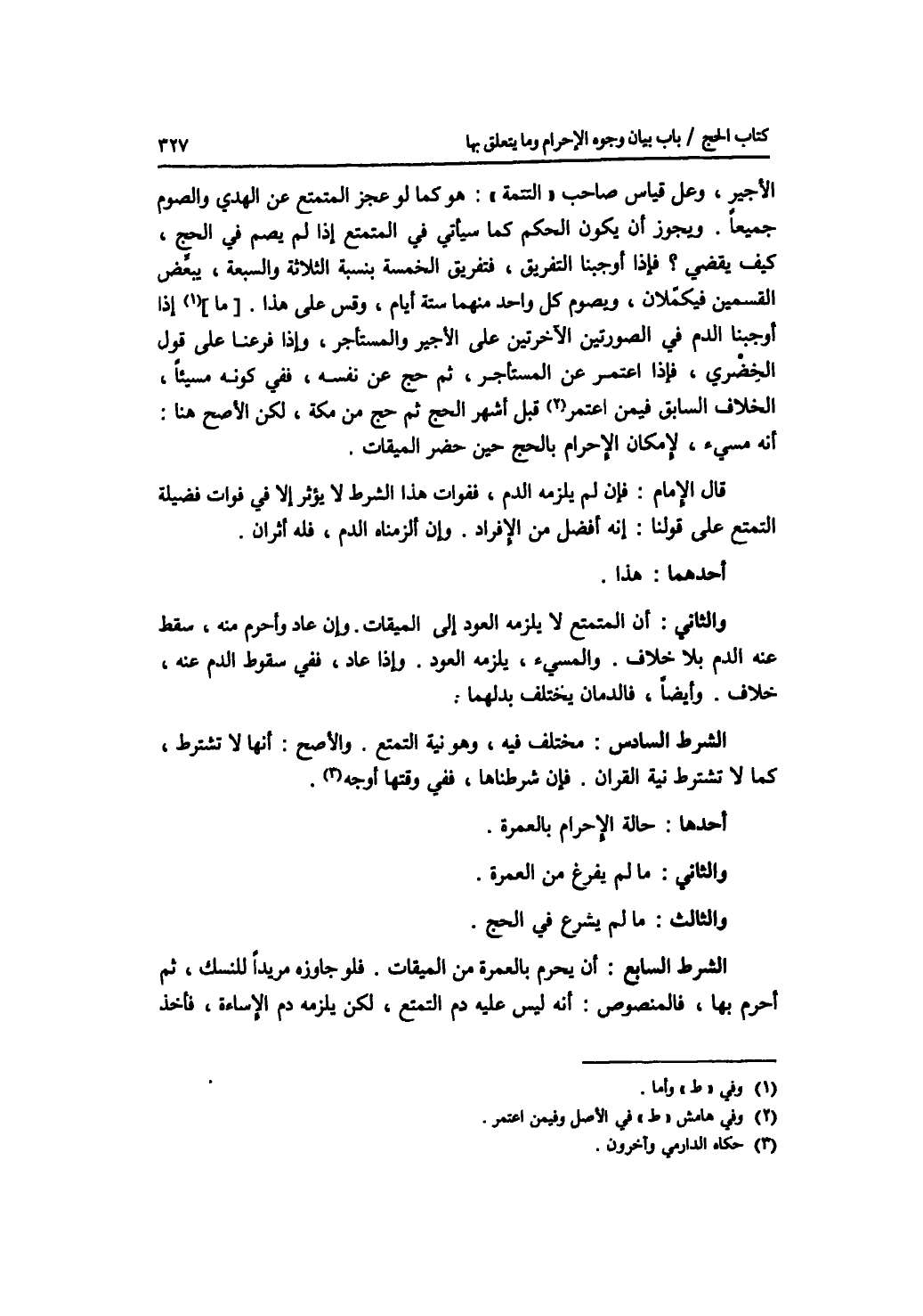 الاجير. وعلى قياس صاحب التتمة: هو كما لو عجز المتمتع عن الهدي والصوم جميعا. ويجوز أن يكون الحكم كما سيأتي في المتمتع إذا لم يصم في الحج، كيف يقضي ؟ فإذا أوجبنا التفريق، فتفريق الخمسة بنسبة الثلاثة والسبعة، يبعض القسمين فيكملان، ويصوم كل واحد منهما ستة أيام، وقس على هذا. أما إذا أوجبنا الدم في الصورتين الآخرتين على الاجير والمستأجر، وإذا فرعنا على قول الخضري، فإذا اعتمر عن المستأجر، ثم حج عن نفسه، ففي كونه مسيئا، الخلاف السابق فيمن اعتمر قبل أشهر الحج ثم حج من مكة، لكن الاصح هنا: أنه مسئ، لامكان الاحرام بالحج حين حضر الميقات. قال الامام: فإن لم يلزمه الدم، ففوات هذا الشرط لا يؤثر إلا في فوات فضيلة التمتع على قولنا: إنه أفضل من الافراد. وإن ألزمناه الدم، فله أثران. أحدهما: هذا. والثاني: أن المتمتع لا يلزمه العود إلى الميقات. وإن عاد وأحرم منه، سقط عنه الدم بلا خلاف. والمسئ، يلزمه العود. وإذا عاد، ففي سقوط الدم عنه، خلاف. وأيضا، فالدمان يختلف بدلهما. الشرط السادس: مختلف فيه، وهو نية التمتع. والاصح: أنها لا تشترط، كما لا تشترط نية القران. فإن شرطناها، ففي وقتها أوجه. أحدها: حالة الاحرام بالعمرة. والثاني: ما لم يفرغ من العمرة. والثالث: ما لم يشرع في الحج. الشرط السابع: أن يحرم بالعمرة من الميقات. فلو جاوزه مريدا للنسك، ثم أحرم بها، فالمنصوص: أنه ليس عليه دم التمتع، لكن يلزمه دم الاساءة، فأخذ