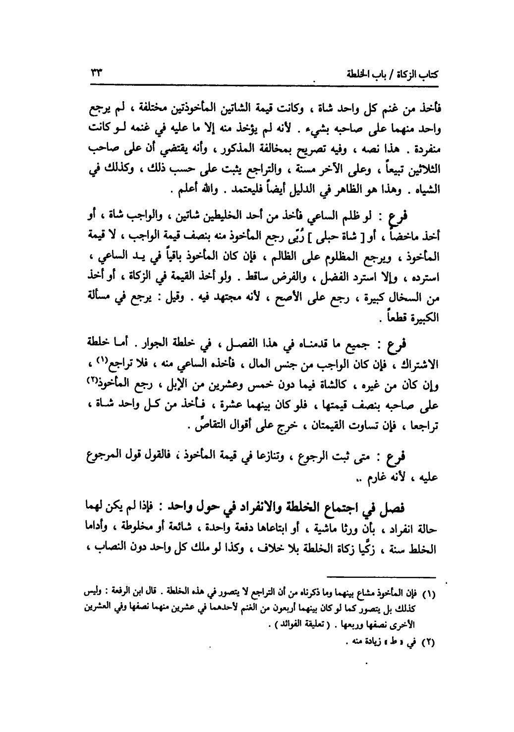 فأخذ من غنم كل واحد شاة، وكانت قيمة الشاتين المأخوذتين مختلفة، لم يرجع واحد منهما على صاحبه بشئ، لانه لم يؤخذ منه إلا ما عليه في غنمه لو كانت منفردة. هذا نصه، وفيه تصريح بمخالفة المذكور، وأنه يقتضي أن على صاحب الثلاثين تبيعا، وعلى الآخر مسنة، والتراجع يثبت على حسب ذلك، وكذلك في الشياه. وهذا هو الظاهر في الدليل أيضا فليعتمد. والله أعلم. فرع لو ظلم الساعي فأخذ من أحد الخليطين شاتين، والواجب شاة، أو أخذ ماخضا، أو (شاة حبلى) ربى رجع المأخوذ منه بنصف قيمة الواجب، لا قيمة المأخوذ، ويرجع المظلوم على الظالم، فإن كان المأخوذ باقيا في يد الساعي، استرده، وإلا استرد الفضل، والفرض ساقط. ولو أخذ القيمة في الزكاة، أو أخذ من السخال كبيرة، رجع على الاصح، لانه مجتهد فيه. وقيل: يرجع في مسألة الكبيرة قطعا. فرع جميع ما قدمناه في هذا الفصل، في خلطة الجوار. أما خلطة الاشتراك، فإن كان الواجب من جنس المال، فأخذه الساعي منه، فلا تراجع، وإن كان من غيره، كالشاة فيما دون خمس وعشرين من الابل، رجع المأخوذ منه على صاحبه بنصف قيمتها، فلو كان بينهما عشرة، فأخذ من كل واحد شاة، تراجعا، فإن تساوت القيمتان، خرج على أقوال التقاص. فرع متى ثبت الرجوع، وتنازعا في قيمة المأخوذ، فالقول قول المرجوع عليه، لانه غارم. فصل في اجتماع الخلطة والانفراد في حول واحد فإذا لم يكن لهما حالة انفراد، بأن ورثا ماشية، أو ابتاعاها دفعة واحدة، شائعة أو مخلوطة، وأداما الخلط سنة، زكيا زكاة الخلطة بلا خلاف، وكذا لو ملك كل واحد دون النصاب،