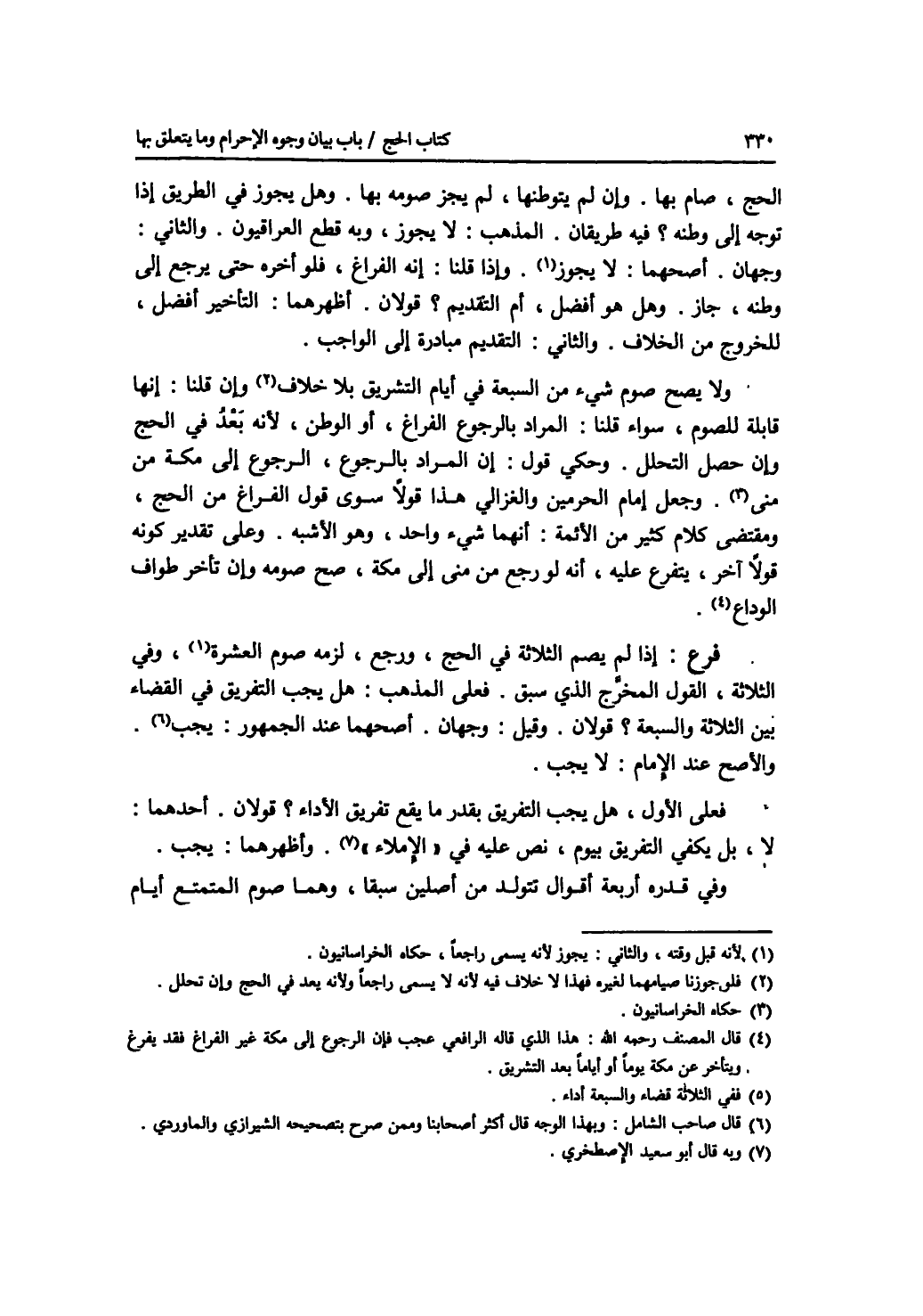 الحج، صام بها. وإن لم يتوطنها، لم يجز صومه بها. وهل يجوز في الطريق إذا توجه إلى وطنه ؟ فيه طريقان. المذهب: لا يجوز، وبه قطع العراقيون. والثاني: وجهان. أصحهما: لا يجوز. وإذا قلنا: إنه الفراغ، فلو أخره حتى يرجع إلى وطنه، جاز. وهل هو أفضل، أم التقديم ؟ قولان. أظهرهما: التأخير أفضل، للخروج من الخلاف. والثاني: التقديم مبادرة إلى الواجب. ولا يصح صوم شئ من السبعة في أيام التشريق بلا خلاف وإن قلنا: إنها قابلة للصوم، سواء قلنا: المراد بالرجوع الفراغ، أو الوطن، لانه بعد في الحج وإن حصل التحلل. وحكي قول: إن المراد بالرجوع، الرجوع إلى مكة من منى. وجعل إمام الحرمين والغزالي هذا قولا سوى قول الفراغ من الحج، ومقتضى كلام كثير من الائمة: أنهما شئ واحد، وهو الاشبه. وعلى تقدير كونه قولا آخر، يتفرع عليه، أنه لو رجع من منى إلى مكة، صح صومه وإن تأخر طواف الوداع. فرع إذا لم يصم الثلاثة في الحج، ورجع، لزمه صوم العشرة. وفي الثلاثة، القول المخرج الذي سبق. فعلى المذهب: هل يجب التفريق في القضاء بين الثلاثة والسبعة ؟ قولان. وقيل: وجهان. أصحهما عند الجمهور: يجب. والاصح عند الامام: لا يجب. فعلى الاول، هل يجب التفريق بقدر ما يقع تفريق الاداء ؟ قولان. أحدهما: لا، بل يكفي التفريق بيوم، نص عليه في الاملاء. وأظهرهما: يجب. وفي قدره أربعة أقول تتولد من أصلين سبقا، وهما صوم المتمتع أيام
