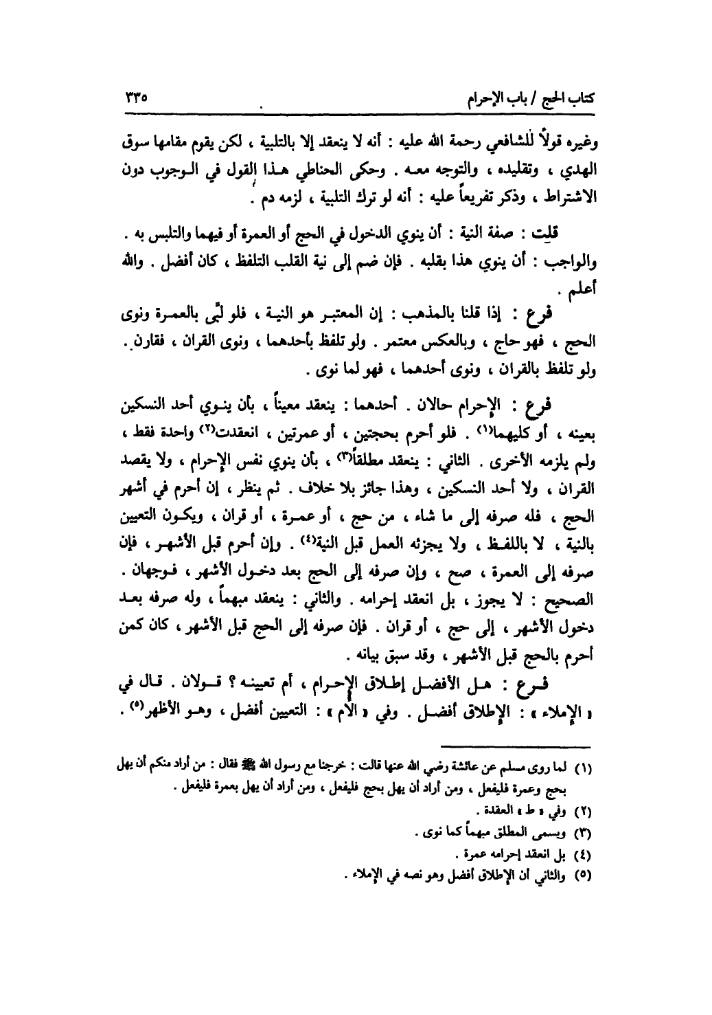 وغيره قولا للشافعي رحمة الله عليه: أنه لا ينعقد إلا بالتلبية، لكن يقوم مقامها سوق الهدي، وتقليده، والتوجه معه. وحكى الحناطي هذا القول في الوجوب دون الاشتراط، وذكر تفريعا عليه: أنه لو ترك التلبية، لزمه دم. قلت: صفة النية: أن ينوي الدخول في الحج أو العمرة أو فيهما والتلبس به. والواجب: أن ينوي هذا بقلبه. فإن ضم إلى نية القلب التلفظ، كان أفضل. والله أعلم. فرع إذا قلنا بالمذهب: إن المتعبر هو النية، فلو لبى بالعمرة ونوى الحج، فهو حاج، وبالعكس معتمر. ولو تلفظ بأحدهما، ونوى القران، فقارن. ولو تلفظ بالقران، وونوى أحدهما، فهو لما نوى. فرع الاحرام حالان. أحدهما: ينعقد معينا، بأن ينوي أحد النسكين بعينه، أو كليهما. فلو أحرم بحجتين، أو عمرتين، انعقدة واحدة فقط، ولم يلزمه الاخرى. الثاني: ينعقد مطلقا، بأن ينوي نفس الاحرام، ولا يقصد القران، ولا أحد النسكين، وهذا جائز بلا خلاف. ثم ينظر، إن أحرم في أشهر الحج، فله صرفه إلى ما شاء، من حج، أو عمرة، أو قران، ويكون التعيين بالنية، لا باللفظ، ولا يجزئه العمل قبل النية. وإن أحرم قبل الاشهر، فإن صرفه إلى العمرة، صح، وإن صرفه إلى الحج بعد دخول الاشهر، فوجهان. الصحيح: لا يجوز، بل انعقد إحرامه. والثاني: ينعقد مبهما، وله صرفه بعد دخول الاشهر، إلى حج، أو قران. فإن صرفه إلى الحج قبل الاشهر، كان كمن أحرم بالحج قبل الاشهر، وقد سبق بيانه. فرع هل الافضل إطلاق الاحرام، أم تعيينه ؟ قولان. قال في الاملاء: الاطلاق أفضل. وفي الام: التعيين أفضل، وهو الاظهر.