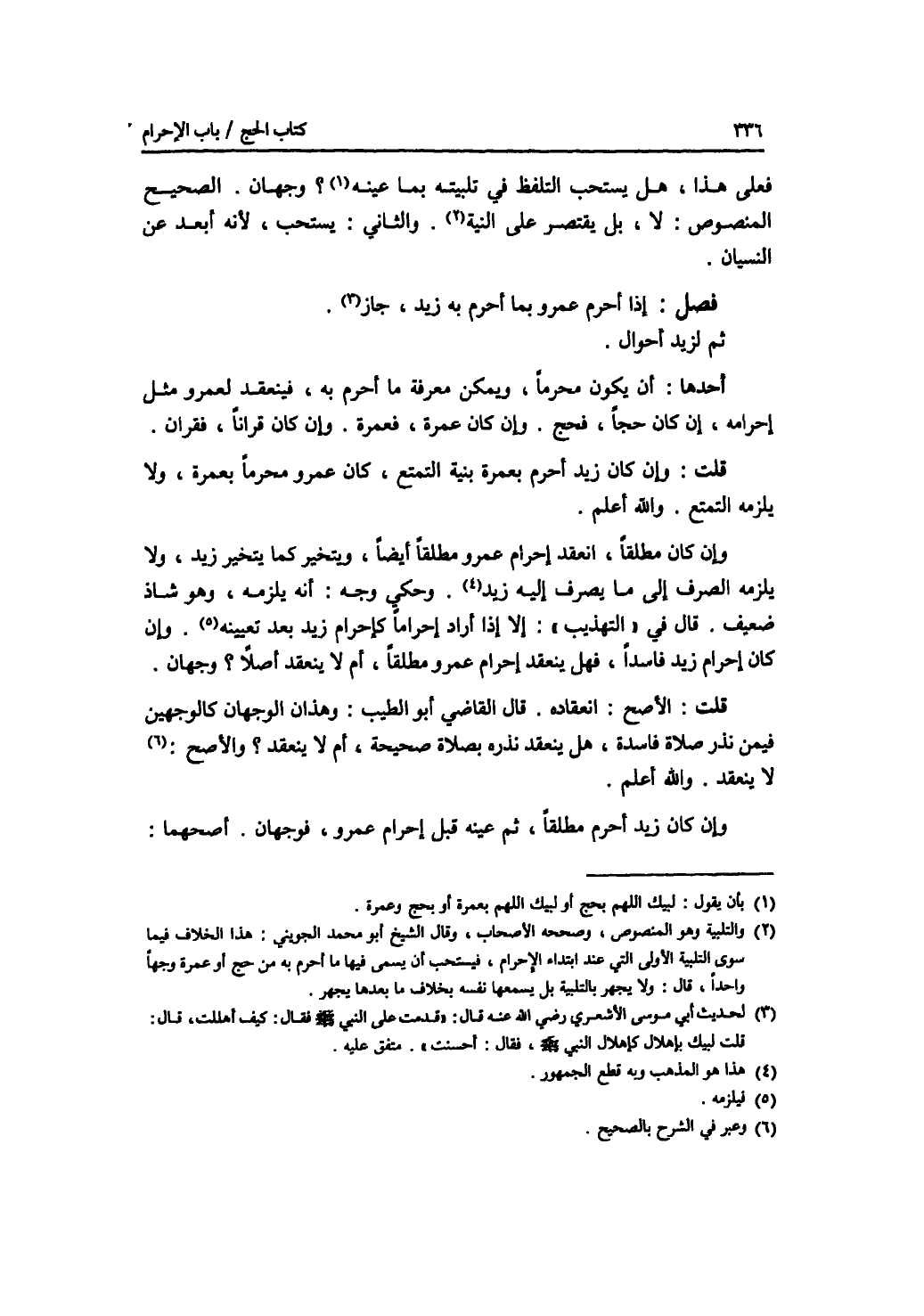 فعلى هذا، هل يستحب التلفظ في تلبيته بما عينه ؟ وجهان. الصحيح المنصوص: لا، بل يقتصر على النية. والثاني: يستحب، لانه أبعد عن النسيان. فصل إذا أحرم عمرو بما أحرم به زيد، جاز. ثم لزيد أحوال. أحدها: أن يكون محرما، ويمكن معرفة ما أحرم به، فينعقد لعمرو مثل إحرامه، إن كان حجا، فحج. وإن كان عمرة، فعمرة. وإن كان قرانا، فقران. قلت: وإن كان زيد أحرم بعمرة بنية التمتع، كان عمرو محرما بعمرة، ولا يلزمه التمتع. والله أعلم. وإن كان مطلقا، انعقد إحرام عمرو مطلقا أيضا، ويتخير كما يتخير زيد، ولا يلزمه الصرف إلى ما يصرف إليه زيد. وحكي وجه: أنه يلزمه، وهو شاذ ضعيف. قال في التهذيب: إلا إذا أراد إحراما كإحرام زيد بعد تعيينه. وإن كان إحرام زيد فاسدا، فهل ينعقد إحرام عمرو مطلقا، أم لا ينعقد أصلا ؟ وجهان. قلت: الاصح: انعقاده. قال القاضي أبو الطيب: وهذان الوجهان كالوجهين فيمن نذر صلاة فاسدة، هل ينعقد نذره بصلاة صحيحة، أم لا. ينعقد ؟ والاصح: لا ينعقد. والله أعلم. وإن كان زيد أحرم مطلقا، ثم عينه قبل إحرام عمرو، فوجهان. أصحهما: