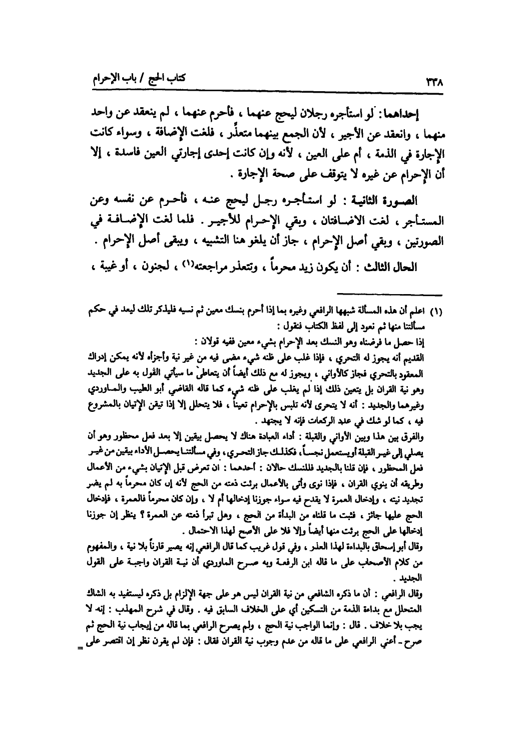 أحدهما: لو استأجره رجلان ليحج عنهما، فأحرم عنهما، لم ينعقد عن واحد منهما، وانعقد عن الاجير، لان الجمع بينهما متعذر، فلغت الاضافة، وسواء كانت الاجارة في الذمة، أم على العين، لانه وإن كانت إحدى إجارتي العين فاسدة، إلا أن الاحرام عن غيره لا يتوقف على صحة الاجارة. الصورة الثانية: لو استأجره رجل ليحج عنه، فأحرم عن نفسه وعن المستأجر، لغت الاضافتان، وبقي الاحرام للاجير. فلما لغت الاضافة في الصورتين، وبقي أصل الاحرام، جاز أن يلغو هنا التشبيه، ويبقى أصل الاحرام. الحال الثالث: أن يكون زيد محرما، وتتعذر مراجعته، لجنون، أو غيبة،