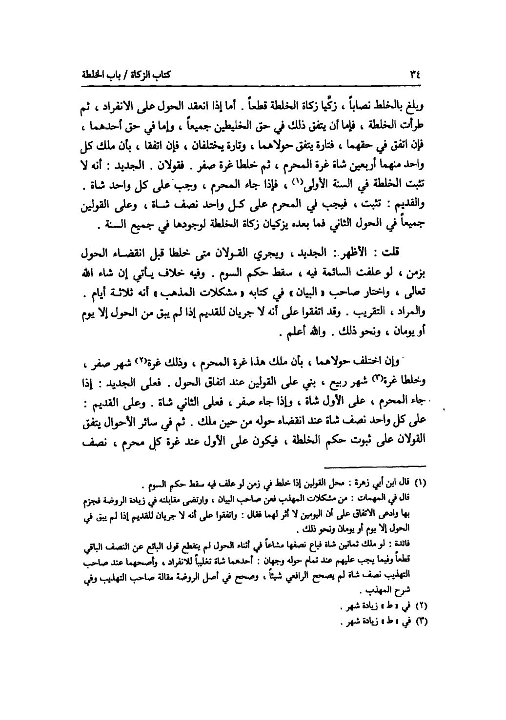 وبلغ بالخلط نصابا، زكيا زكاة الخلطة قطعا. أما إذا انعقد الحول على الانفراد، ثم طرأت الخلطة، فإما إن يتفق ذلك في حق الخليطين جميعا، وإما في حق أحدهما، فإن اتفق في حقهما، فتارة يتفق حولاهما، وتارة يختلفان، فإن اتفقا، بأن ملك كل واحد منهما أربعين شاة غرة المحرم، ثم خلطا غرة صفر، فقولان. الجديد: أنه لا تثبت الخلطة في السنة الاولى، فإذا جاء المحرم، وجب على كل واحد شاة. والقديم: تثبت، فيجب في المحرم على كل واحد نصف شاة، وعلى القولين جميعا في الحول الثاني فما بعده يزكيان زكاة الخلطة لوجودها في جميع السنة. قلت: الاظهر: الجديد، ويجري القولان متى خلطا قبل انقضاء الحول بزمن، لو علفت السائمة فيه، سقط حكم السوم. وفيه خلاف يأتي إن شاء الله تعالى. واختار صاحب البيان في كتابه مشكلات المذهب أنه ثلاثة أيام. والمراد، التقريب. وقد اتفقوا على أنه لا جريان للقديم إذا لم يبق من الحول إلا يوم أو يومان، ونحو ذلك. والله أعلم. وإن اختلف حولاهما، بأن ملك هذا غرة المحرم، وذلك غرة شهر صفر، وخلطا غرة شهر ربيع، بني على القولين عند اتفاق الحول. فعلى الجديد: إذا جاء المحرم، على الاول شاة، وإذا جاء صفر، فعلى الثانية شاة. وعلى القديم: على كل واحد نصف شاة عند انقضاء حوله من حين ملك. ثم في سائر الاحوال يتفق القولان على ثبوت حكم الخلطة، فيكون على الاول عند غرة كل محرم، نصف