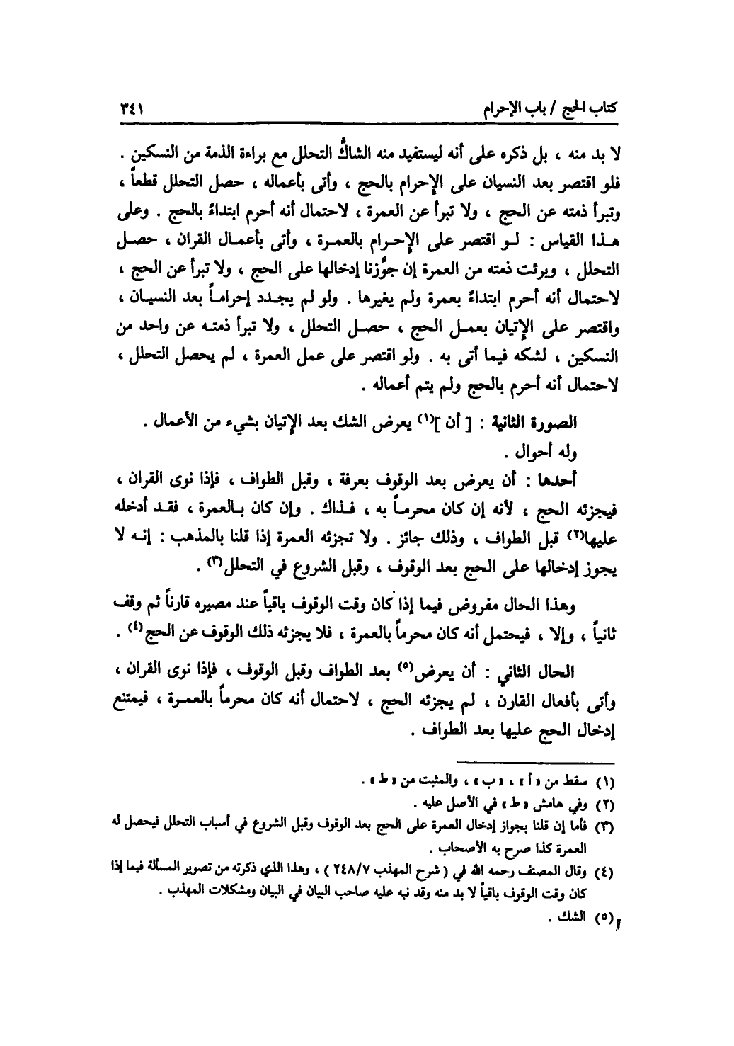 لا بد منه، بل ذكره على أنه ليستفيد منه الشاك التحلل مع براءة الذمة من النسكين. فلو اقتصر بعد النسيان على الاحرام بالحج، وأتى بأعماله، حصل التحلل قطعا، وتبرأ ذمته عن الحج، ولا تبرأ عن العمرة، لاحتمال أنه أحرم ابتداء بعمرة بالحج. وعلى هذا القياس: لو اقتصر على الاحرام بالعمرة، وأتى بأعمال القران، حصل التحلل، وبرئت ذمته من العمرة إن جوزنا إدخالها على الحج، ولا تبرأ عن الحج، لاحتمال أنه أحرم ابتداء ولم يغيرها. ولو لم يجدد إحراما بعد النسيان، واقتصر على الاتيان بعمل الحج، حصل التحلل، ولا تبرأ ذمته عن واحد من النسكين، لشكه فيما أتى به. ولو اقتصر على عمل العمرة، لم يحصل التحلل، لاحتمال أنه أحرم بالحج ولم يتم أعماله. الصورة الثانية: أن يعرض الشك بعد الاتيان بشئ من الاعمال، وله أحوال. أحدها: أن يعرض بعد الوقوف بعرفة، وقبل الطواف، فإذا نوى القران، فيجزئه الحج، لانه إن كان محرما به، فذاك. وإن كان بالعمرة، فقد أدخله عليها قبل الطواف، وذلك جائز. ولا تجزئه العمرة إذا قلنا بالمذهب: إنه لا يجوز إدخالها على الحج بعد الوقوف وقبل الشروع في التحلل. وهذا الحال مفروض فيما إذا كان وقت الوقوف باقيا عند مصيره قارنا ثم وقف ثانيا، وإلا، فيحتمل أنه كان محرما بالعمرة، فلا يجزئه ذلك الوقوف عن الحج. الحال الثاني: أن يعرض بعد الطواف وقبل الوقوف، فإذا نوى القران، وأتى بأفعال القارن، لم يجزئه الحج، لاحتمال أنه كان محرما بالعمرة، فيمتنع إدخال الحج عليها بعد الطواف.