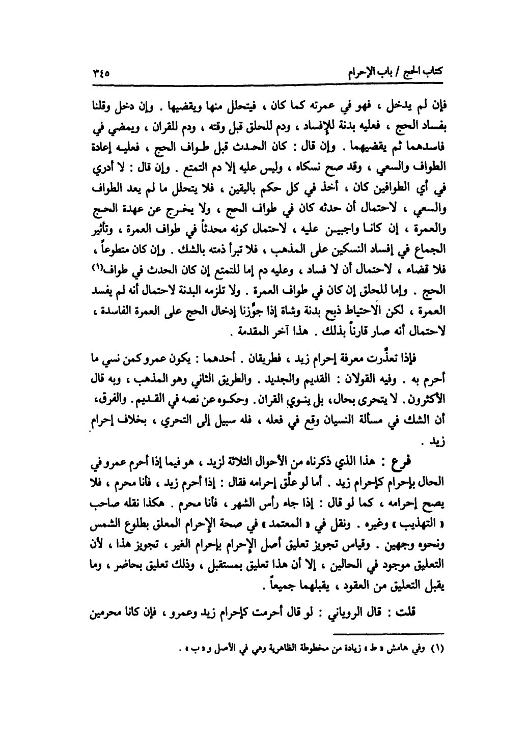 فإن لم يدخل، فهو في عمرته كما كان، فيتحلل منها ويقضيها. وإن دخل وقلنا بفساد الحج، فعليه بدنة للافساد، ودم للحلق قبل وقته، ودم للقران، ويمضي في فاسدهما ثم يقضيهما. وإن قال: كان الحدث قبل طواف الحج، فعليه إعادة الطواف والسعي، وقد صح نسكاه، وليس عليه إلا دم التمتع. وإن قال: لا أدري في أي الطوافين كان، أخذ في كل حكم باليقين، فلا يتحلل ما لم يعد الطواف والسعي، لاحتمال أن حدثه كان في طواف الحج، ولا يخرج عن عهدة الحج والعمرة، إن كانا واجبين عليه، لاحتمال كونه محدثا في طواف العمرة، وتأثير الجماع في إفساد النسكين على المذهب، فلا تبرأ ذمته بالشك. وإن كان متطوعا، فلا قضاء، لاحتمال أن لا فساد، وعليه دم إما للتمتع إن كان الحدث في طواف الحج. وإما للحلق إن كان في طواف العمرة. ولا تلزمه البدنة لاحتمال أنه لم يفسد العمرة، لكن الاحتياط ذبح بدنة وشاة إذا جوزنا إدخال الحج على العمرة الفاسدة، لاحتمال أنه صار قارنا بذلك. هذا آخر المقدمة. فإذا تعذرت معرفة إحرام زيد، فطريقان. أحدهما: يكون عمرو كمن نسي ما أحرم به. وفيه القولان: القديم والجديد. والطريق الثاني وهو المذهب، وبه قال الاكثرون: لا يتحرى بحال، بل ينو القران. وحكوه عن نصه في القديم. والفرق، أن الشك في مسألة النسيان وقع في فعله، فله سبيل إلى التحري، بخلاف إحرام زيد. فرع هذا الذي ذكرناه من الاحوال الثلاثة لزيد، هو فيما إذا أحرم عمرو في الحال بإحرام كإحرام زيد. أما لو علق إحرامه فقال: إذا أحرم زيد، فأنا محرم، فلا يصح إحرامه، كما لو قال: إذا جاء رأس الشهر، فأنا محرم. هكذا نقله صاحب التهذيب وغيره. ونقل في المعتمد في صحة الاحرام المعلق بطلوع الشمس ونحوه وجهين. وقياس تجويز تعليق أصل الاحرام بإحرام الغير، تجويز هذا، لان التعليق موجود في الحالين، إلا أن هذا تعليق بمستقبل، وذلك تعليق بحاضر، وما يقبل التعليق من العقود، يقبلهما جميعا. قلت: قال الروياني: لو قال أحرمت كإحرام زيد وعمرو، فإن كانا محرمين