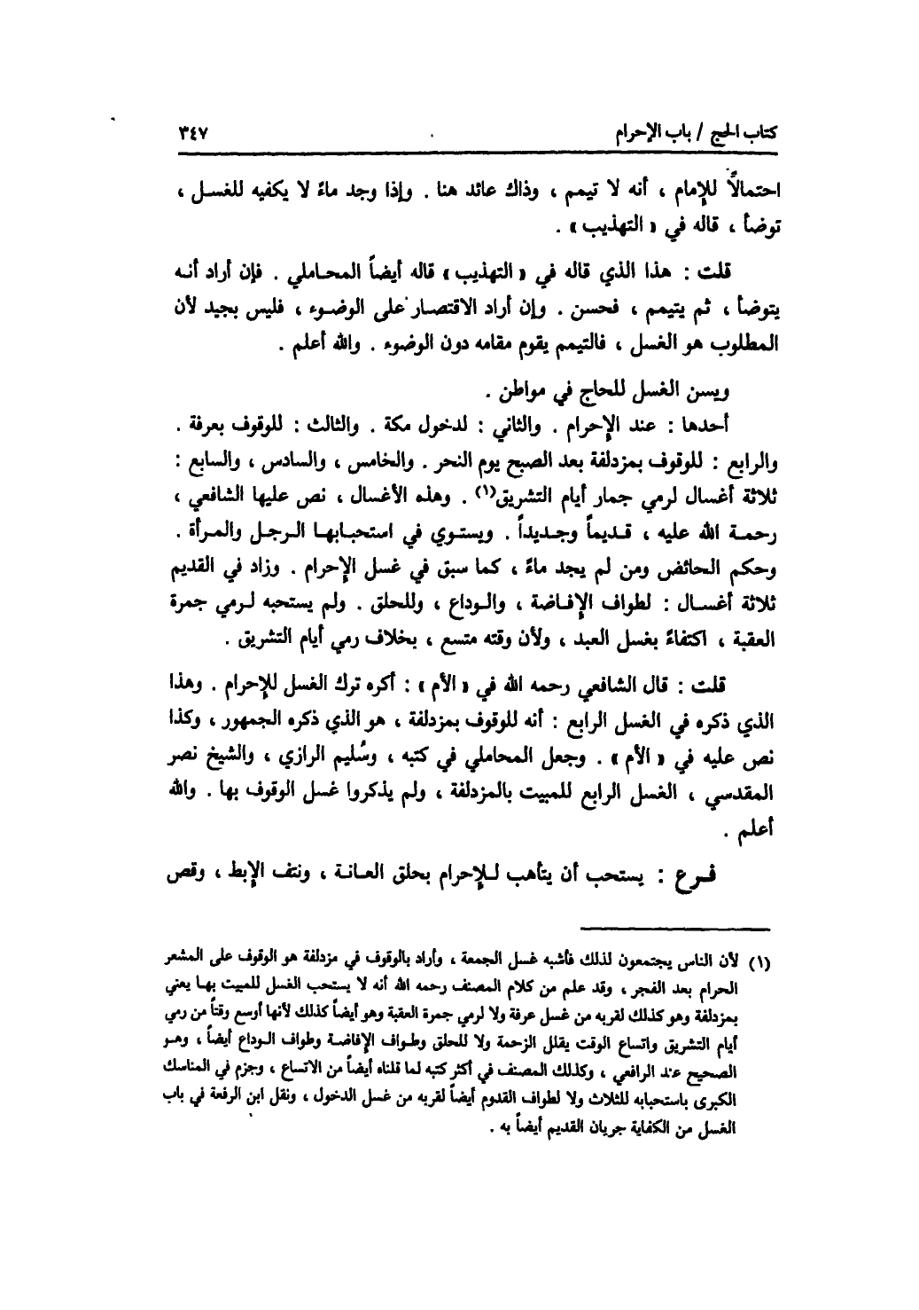 احتمالا للامام، أنه لا تيمم، وذاك عائد هنا. وإذا وجد ماء لا يكفيه للغسل، توضأ، قاله في التهذيب. قلت: هذا الذي قاله في التهذيب قاله أيضا المحاملي. فإن أراد أنه يتوضأ، ثم يتيمم، فحسن. وإن أراد الاقتصار على الوضوء، فليس بجيد لان المطلوب هو الغسل، فالتيمم يقوم مقامه دون الوضوء. والله أعلم. ويسن الغسل للحاج في مواطن. أحدها: عند الاحرام. والثاني: لدخول مكة. والثالث: للوقوف بعرفة. والرابع: للوقوف بمزدلفة بعد الصبح يوم النحر. والخامس، والسادس، والسابع: ثلاثة أغسال لرمي جمار أيام التشريق. وهذه الاغسال، نص عليها الشافعي، رحمة الله عليه، قديما وجديدا. ويستوي في استحبابها، الرجل والمرأة. وحكم الحائض ومن لم يجد ماء، كما سبق في غسل الاحرام. وزاد في القديم ثلاثة أغسال: لطواف الافاضة، والوداع، وللحلق، ولم يستحبه لرمي جمرة العقبة، اكتفاء بغسل العيد، ولان وقته متسع، بخلاف رمي أيام التشريق. قلت: قال الشافعي رحمه الله في الام: أكره ترك الغسل للاحرام. وهذا الذي ذكره في الغسل الرابع: أنه للوقوف بمزدلفة، هو الذي ذكره الجمهور، وكذا نص عليه في الام. وجعل المحاملي في كتبه، وسليم الرازي، والشيخ نصر المقدسي، الغسل الرابع للمبيت بالمزدلفة، ولم يذكروا غسل الوقوف بها. والله أعلم. فرع يستحب أن يتأهب للاحرام بحلق العانة، ونتف الابط، وقص