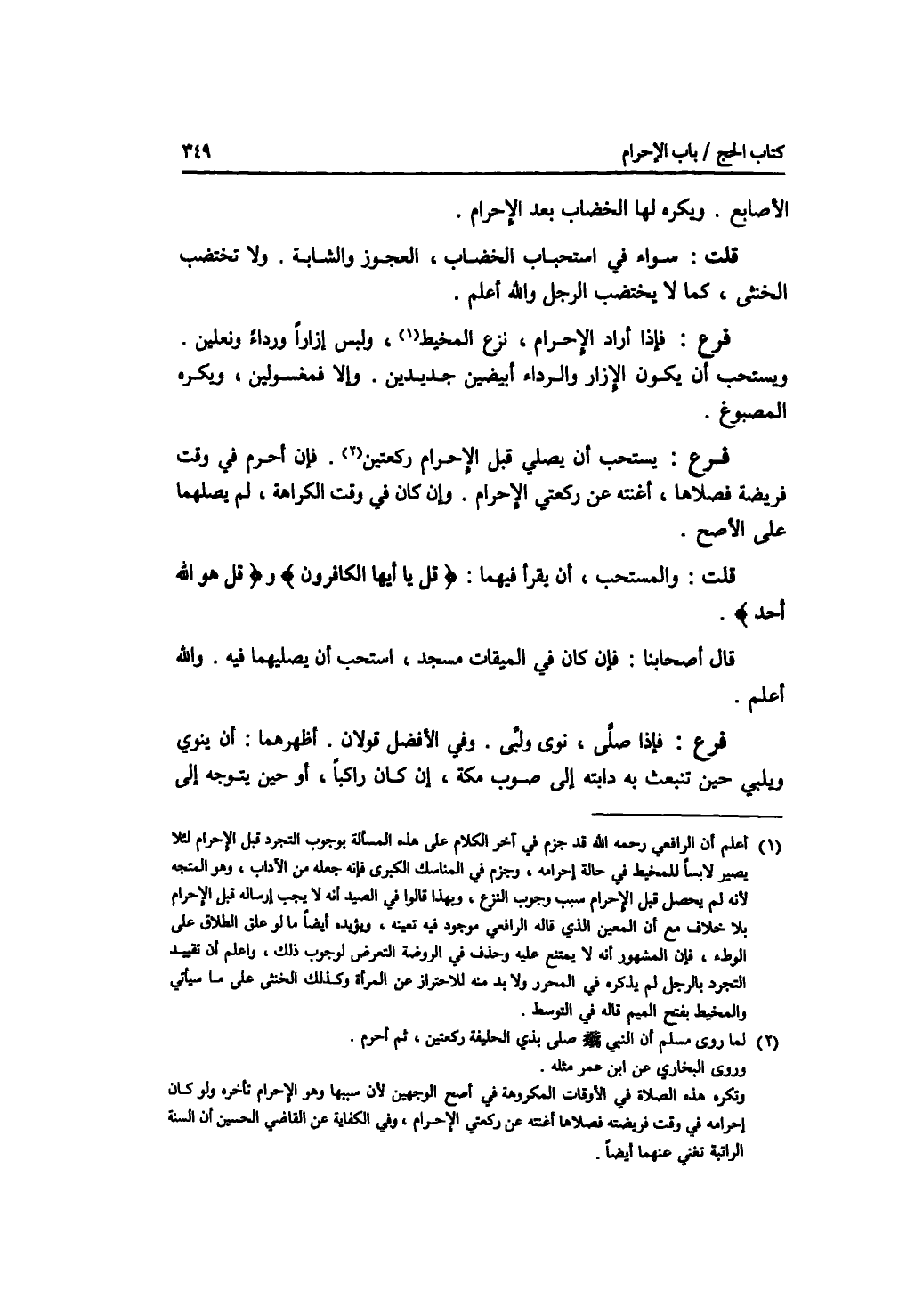 الاصابع. ويكره لها الخضاب بعد الاحرام. قلت: سواء في استحباب الخضاب، العجوز والشابة. ولا تختضب الخنثى، كما لا يختضب الرجل. والله أعلم. فرع فإذا أراد الاحرام، نزع المخيط، ولبس إزارا ورداء ونعلين. ويستحب أن يكون الازار والرداء أبيضين جديدين، وإلا فمغسولين، ويكره المصبوغ. فرع يستحب أن يصلي قبل الاحرام ركعتين. فإن أحرم في وقت فريضة فصلاها، أغنته عن ركعتي الاحرام. وإن كان في وقت الكراهة، لم يصلهما على الاصح. قلت: والمستحب، أن يقرأ فيهما: * (قل يا أيها الكافرون) * و * (قل هو الله أحد) *. قال أصحابنا: فإن كان في الميقات مسجد، استحب أن يصليهما فيه. والله أعلم. فرع فإذا صلى، نوى ولبى. وفي الافضل قولان. أظهرهما: أن ينوي ويلبي حين تنبعث به دابته إلى صوب مكة، إن كان راكبا، أو حين يجوجه إلى
