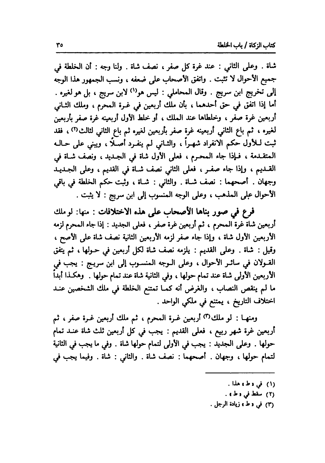 شاة. وعلى الثاني: عند غرة كل صفر، نصف شاة. ولنا وجه: أن الخلطة في جميع الاحوال لا تثبت. واتفق الاصحاب على ضعفه، ونسب الجمهور هذا الوجه إلى تخريج ابن سريج. وقال المحاملي: ليس هذا لابن سريج، بل هو لغيره. أما إذا اتفق في حق أحدهما، بأن ملك أربعين في غرة المحرم، وملك الثاني أربعين غرة صفر، وخلطاها عند الملك، أو خلط الاول أربعينه غرة صفر بأربعين لغيره، ثم باع الثاني أربعينه غرة صفر بأربعين لغيره ثم باع الثاني لثالث، فقد ثبت للاول حكم الانفراد شهرا، والثاني لم ينفرد أصلا، ويبني على حاله المتقدمة، فإذا جاء المحرم، فعلى الاول شاة في الجديد، ونصف شاة في القديم، وإذا جاء صفر، فعلى الثاني نصف شاة في القديم، وعلى الجديد وجهان. أصحهما: نصف شاة. والثاني: شاة، وثبت حكم الخلطة في باقي الاحوال على المذهب، وعلى الوجه المنسوب إلى ابن سريج: لا يثبت. فرع في صور بناها الاصحاب على هذه الاختلافات منها: لو ملك أربعين شاة غرة المحرم، ثم أربعين غرة صفر، فعلى الجديد: إذا جاء المحرم لزمه الاربعين الاول شاة، وإذا جاء صفر لزمه الاربعين الثانية نصف شاة على الاصح، وقيل: شاة. وعلى القديم: يلزمه نصف شاة لكل أربعين في حولها، ثم يتفق القولان في سائر الاحوال، وعلى الوجه المنسوب إلى ابن سريج: يجب في الاربعين الاولى شاة عند تمام حولها، وفي الثانية شاة عند تمام حولها. وهكذا أبدا ما لم ينقص النصاب، والغرض أنه كما تمتنع الخلطة في ملك الشخصين عند اختلاف التاريخ، يمتنع في ملكي الواحد. ومنها: لو ملك الرجل أربعين غرة المحرم، ثم ملك أربعين غرة صفر، ثم أربعين غرة شهر ربيع، فعلى القديم: يجب في كل أربعين ثلث شاة عند لتمام حولها. وعلى الجديد: يجب في الاولى لتمام حولها شاة. وفي ما يجب في الثانية لتمام حولها، وجهان. أصحهما: نصف شاة. والثاني: شاة. وفيما يجب في