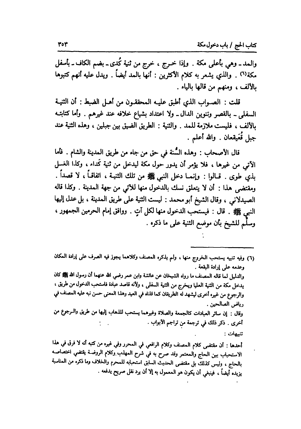 والمد - وهي بأعلى مكة. وإذا خرج، خرج من ثنية كدى - بضم الكاف - بأسفل مكة. والذي يشعر به كلام الاكثرين: أنها بالمد أيضا. ويدل عليه أنهم كتبوها بالالف، ومنهم من قالها بالياء. قلت: الصواب الذي أطبق عليه المحققون من أهل الضبط: أن الثنية السفلى - بالقصر وتنوين الدال - ولا اعتداد بشياع خلافه عند غيرهم. وأما كتابته بالالف، فليست ملازمة للمد. والثنية: الطريق الضيق بين جبلين، وهذه الثنية عند جبل قعيقعان. والله أعلم. قال الاصحاب: وهذه السنة في حق من جاء من طريق المدينة والشام. فأما الآتي من غيرها، فلا يؤمر أن يدور حول مكة ليدخل من ثنية كداء، وكذا الغسل بذي طوى. قالوا: وإنما دخل النبي - صلى الله عليه وسلم - من تلك الثنية، اتفاقا، لا قصدا. ومقتضى هذا: أن لا يتعلق نسك بالدخول منها للآتي من جهة المدينة. وكذا قاله الصيدلاني، وقال الشيخ أبو محمد: ليست الثنية على طريق المدينة، بل عدل إليها النبي - صلى الله عليه وسلم -. قال: فيستحب الدخول منها لكل آت. ووافق إمام الحرمين الجمهور، وسلم للشيخ بأن موضع الثنية على ما ذكره.
