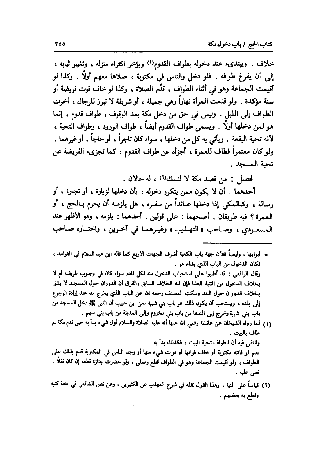 خلاف. ويبتدئ عند دخوله بطواف القدوم، ويؤخر اكتراء منزله، وتغيير ثيابه، إلى أن يفرع طوافه. فلو دخل والناس في مكتوبة، صلاها معهم أولا. وكذا لو أقيمت الجماعة وهو في أثناء الطواف، قدم الصلاة، وكذا لو خاف فوت فريضة أو سنة مؤكدة. ولو قدمت المرأة نهارا وهي جميلة، أو شريفة لا تبرز للرجال، أخرت الطواف إلى الليل، وليس في حق من دخل مكة بعد الوقوف، طواف قدوم، إنما هو لمن دخلها أولا. ويسمى طواف القدوم أيضا، طواف الورود، وطواف التحية، لانه التحية البقعة. ويأتي به كل من دخلها، سواء كان تاجرا، أو حاجا، أو غيرهما. ولو كان معتمرا فطاف للعمرة، أجزأه عن طواف القدوم، كما تجزئ الفريضة عن تحية المسجد. فصل من قصد مكة لا لنسك، له حالان. أحدهما: أن لا يكون ممن يتكرر دخوله، بأن دخلها لزيارة، أو تجارة، أو رسالة، وكالمكي إذا دخلها عائدا من سفره، هل يلزمه أن يحرم بالحج، أو العمرة ؟ فيه طريقان. أصحهما: على قولين. أحدهما: يلزمه، وهو الاظهر عند المسعودي، وصاحب التهذيب وغيرهما في آخرين، واختاره صاحب