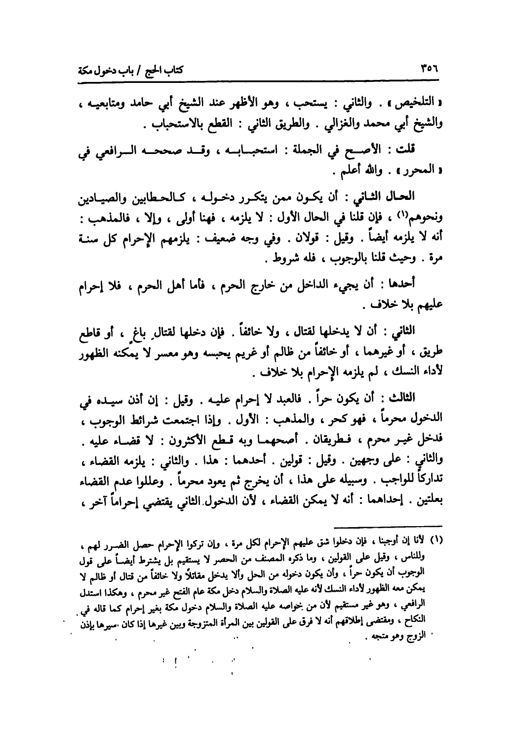 التلخيص. والثاني: يستحب، وهو الاظهر عند الشيخ أبي حامد ومتابعيه، والشيخ أبي محمد والغزالي. والطريق الثاني: القطع بالاستحباب. قلت: الاصح في الجملة: استحبابه، وقد صححه الرافعي في المحرر. والله أعلم. الحال الثاني: أن يكون ممن يتكرر دخوله، كالحطابين والصيادين ونحوهم، فإن قلنا في الحال الاول: لا يلزمه، فهنا أولى، وإلا، فالمذهب: أنه لا يلزمه أيضا. وقيل: قولان. وفي وجه ضعيف: يلزمهم الاحرام كل سنة مرة. وحيث قلنا بالوجوب، فله شروط. أحدها: أن يجئ الداخل من خارج الحرم، فأما أهل الحرم، فلا إحرام عليهم بلا خلاف. الثاني: أن لا يدخلها لقتال، ولا خائفا. فإن دخلها لقتال باغ، أو قاطع طريق، أو غيرهما، أو خائفا من ظالم أو غريم يحبسه وهو معسر لا يمكنه الظهور لاداء النسك، لم يلزمه الاحرام بلا خلاف. الثالث: أن يكون حرا. فالعبد لا إحرام عليه. وقيل: إن أذن سيده في الدخول محرما، فهو كحر، والمذهب: الاول. وإذا اجتمعت شرائط الوجوب، فدخل غير محرم، فطريقان. أصحهما وبه قطع الاكثرون: لا قضاء عليه. والثاني: على وجهين. وقيل: قولين. أحدهما: هذا. والثاني: يلزمه القضاء، تداركا للواجب. وسبيله على هذا، أن يخرج ثم يعود محرما. وعللوا عدم القضاء بعلتين. إحداهما: أنه لا يمكن القضاء، لان الدخول الثاني يقتضي إحراما آخر،