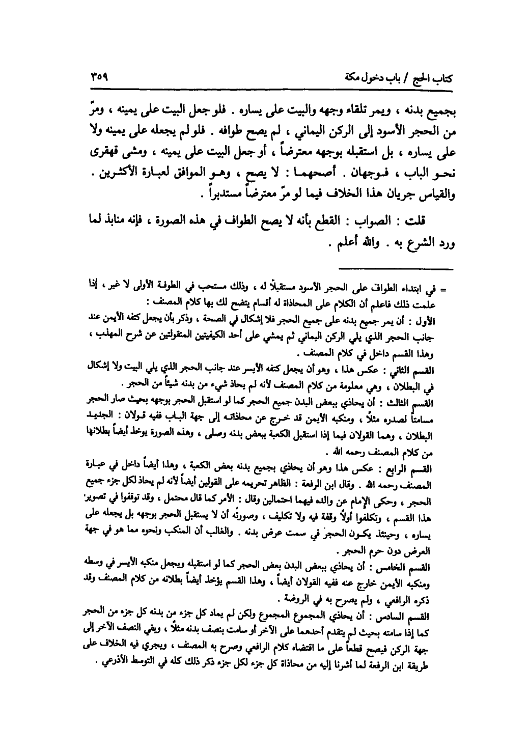 بجميع بدنه، ويمر تلقاء وجهه والبيت على يساره. فلو جعل البيت على يمينه، ومر من الحجر الاسود إلى الركن اليماني، لم يصح طوافه. فلو لم يجعله على يمينه ولا على يساره، بل استقبله بوجهه معترضا، أو جعل البيت على يمينه، ومشى قهقرى نحو الباب، فوجهان. أصحهما: لا يصح، وهو الموافق لعبارة الاكثرين. والقياس جريان هذا الخلاف فيما لو مر معترضا مستدبرا. قلت: الصواب: القطع بأنه لا يصح الطواف في هذا الصورة، فإنه منابذ لما ورد الشرع به. والله أعلم.