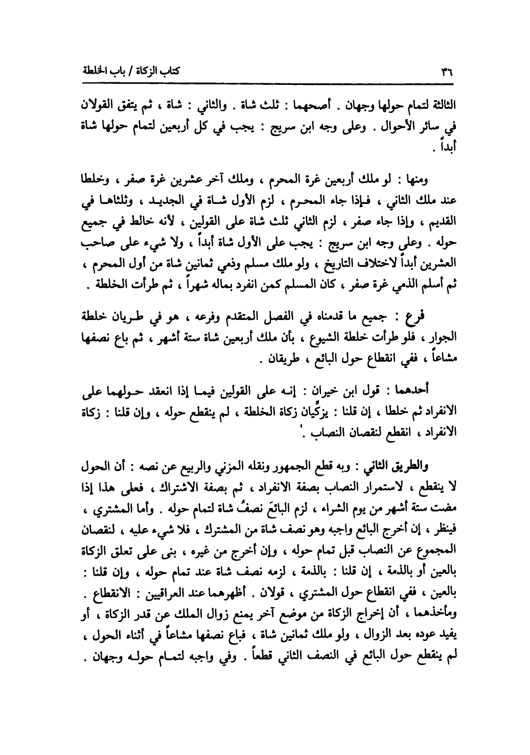 الثالثة لتمام حولها وجهان. أصحهما: ثلث شاة. والثاني: شاة، ثم يتفق القولان في سائر الاحوال. وعلى وجه ابن سريج: يجب في كل أربعين لتمام حولها شاة أبدا. ومنها: لو ملك أربعين غرة المحرم، وملك آخر عشرين غرة صفر، وخلطا عند ملك الثاني، فإذا جاء المحرم، لزم الاول شاة في الجديد، وثلثاها في القديم، وإذا جاء صفر، لزم الثاني ثلث شاة على القولين، لانه خالط في جميع حوله. وعلى وجه ابن سريج: يجب على الاول شاة أبدا، ولا شئ على صاحب العشرين أبدا لاختلاف التاريخ، ولو ملك مسلم وذمي ثمانين شاة من أول المحرم، ثم أسلم الذمي غرة صفر، كان المسلم كمن انفرد بماله شهرا، ثم طرأت الخلطة. فرع جميع ما قدمناه في الفصل المتقدم وفرعه، هو في طريان خلطة الجوار، فلو طرأت خلطة الشيوع، بأن ملك أربعين شاة ستة أشهر، ثم باع نصفها مشاعا، ففي انقطاع حول البائع، طريقان. أحدهما: قول ابن خيران: إنه على القولين فيما إذا انعقد حولهما على الانفراد ثم خلطا، إن قلنا: يزكيان زكاة الخلطة، لم ينقطع حوله، وإن قلنا: زكاة الانفراد، انقطع لنقصان النصاب. والطريق الثاني، وبه قطع الجمهور ونقله المزني والربيع عن نصه: أن الحول لا ينقطع، لاستمرار النصاب بصفة الانفراد، ثم بصفة الاشتراك، فعلى هذا إذا مضت ستة أشهر من يوم الشراء، لزم البائع نصف شاة لتمام حوله. وأما المشتري، فينظر، إن أخرج البائع واجبه وهو نصف شاة من المشتر، فلا شئ عليه، لنقصان المجموع عن النصاب قبل تمام حوله، وإن أخرج من غيره، بنى على تعلق الزكاة بالعين أو بالذمة، إن قلنا: بالذمة، لزمه نصف شاة عند تمام حوله، وإن قلنا: بالعين، ففي انقطاع حول المشتري، قولان. أظهرهما عند العراقيين: الانقطاع. ومأخذهما، أن إخراج الزكاة من موضع آخر يمنع زوال الملك عن قدر الزكاة، أو يفيد عوده بعد الزوال، ولو ملك ثمانين شاة، فباع نصفها مشاعا في أثناء الحول، لم ينقطع حول البائع في النصف الثاني قطعا. وفي واجبه لتمام حوله وجهان.