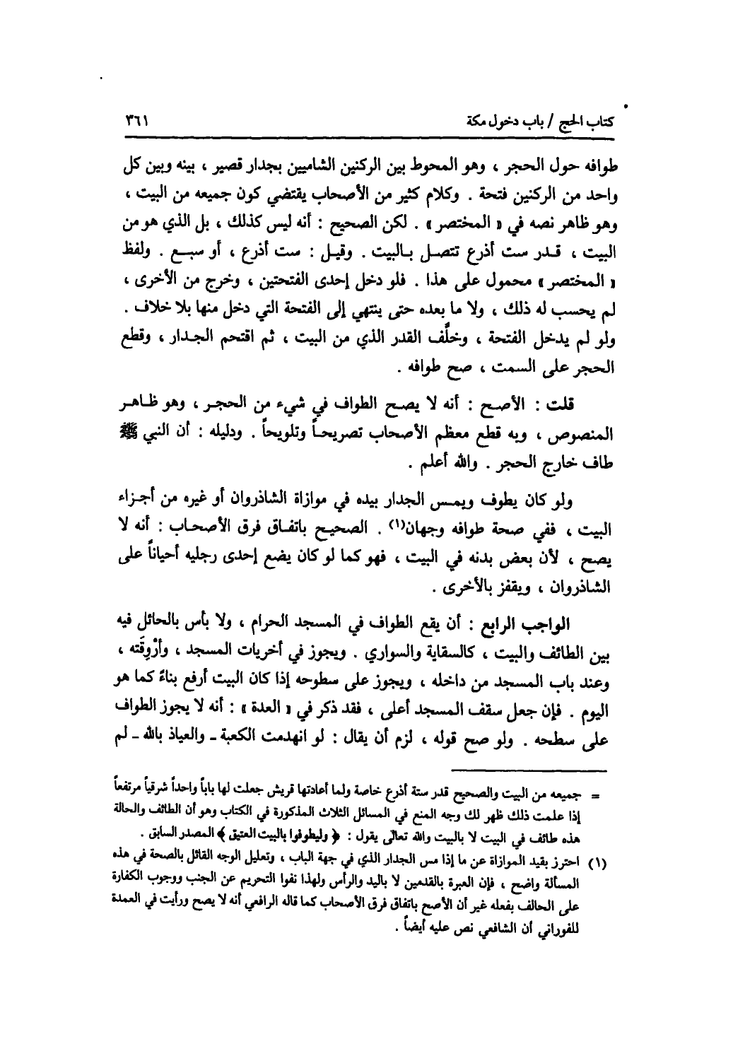 طوافه حول الحجر وهو المحوط بين الركنين الشاميين بجدار قصير، بينه وبين كل واحد من الركنين فتحة. وكلام كثير من الاصحاب يقتضي كون جميعه من البيت، وهو ظاهر نصه في المختصر. لكن الصحيح: أنه ليس كذلك، بل الذي هو من البيت، قدر ست أذرع تتصل بالبيت. وقيل: ست أذرع، أو سبع. ولفظ المختصر محمول على هذا. فلو دخل إحدى الفتحتين، وخرج من الاخرى، لم يحسب له ذلك، ولا ما بعده حتى ينتهي إلى الفتحة التي دخل منها بلا خلاف. ولو لم يدخل الفتحة، وخلف القدر الذي من البيت، ثم اقتحم الجدار، وقطع الحجر على السمت، صح طوافه. قلت: الاصح: أنه لا يصح الطواف في شئ من الحجر، وهو ظاهر المنصوص، وبه قطع معظم الاصحاب تصريحا وتلويحا. ودليله: أن النبي - صلى الله عليه وسلم - طاف خارج الحجر. والله أعلم. ولو كان يطوف ويمس الجدار بيده في موازاة الشاذروان أو غيره من أجزاء البيت، ففي صحة طوافه وجهان. الصحيح باتفاق فرق الاصحاب: أنه لا يصح، لان بعض بدنه في البيت، فهو كما لو كان يضع إحدى رجليه أحيانا على الشاذروان، ويقفز بالاخرى. الواجب الرابع: أن يقع الطواف في المسجد الحرام، ولا بأس بالحائل فيه بين الطائف والبيت، كالسقاية والسواري. ويجوز في أخريات المسجد، وأروقته، وعند باب المسجد من داخله، ويجوز على سطوحه إذا كان البيت أرفع بناء كما هو اليوم. فإن جعل سقف المسجد أعلى، فقد ذكر في العدة: أنه لا يجوز الطواف على سطحه. ولو صح قوله، لزم أن يقال: لو انهدمت الكعبة - والعياذ بالله - لم